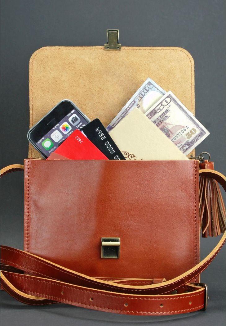 Отделы: 2 отделения и карман для карточек, ремешок регулируем. В конструкции изделия предусмотрено кольцо-люверс, к нему можно крепить кошелек либо ключи с помощью цепочки