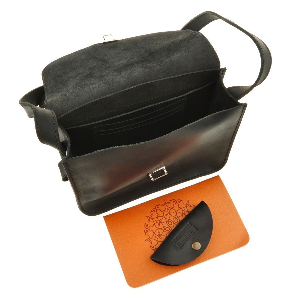 Отделы: 2 отделения и карман для карточек, ремешок регулируем. В конструкции изделия предусмотрено кольцо-люверс, к нему можно крепить кошелек либо ключи с помощью цепочки