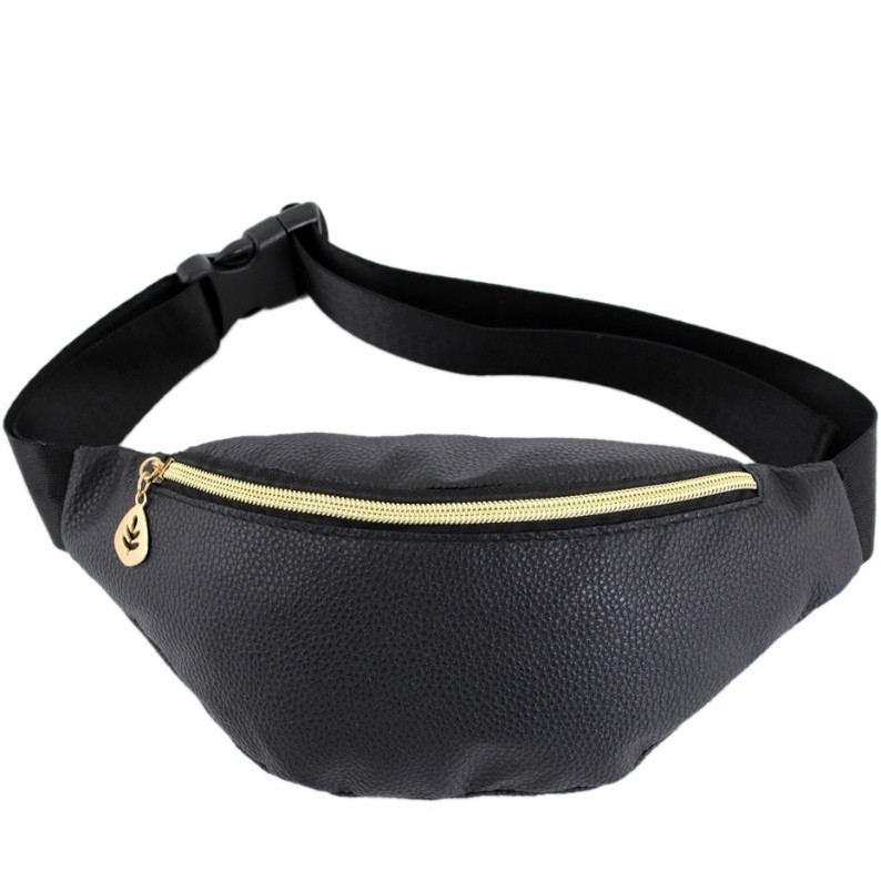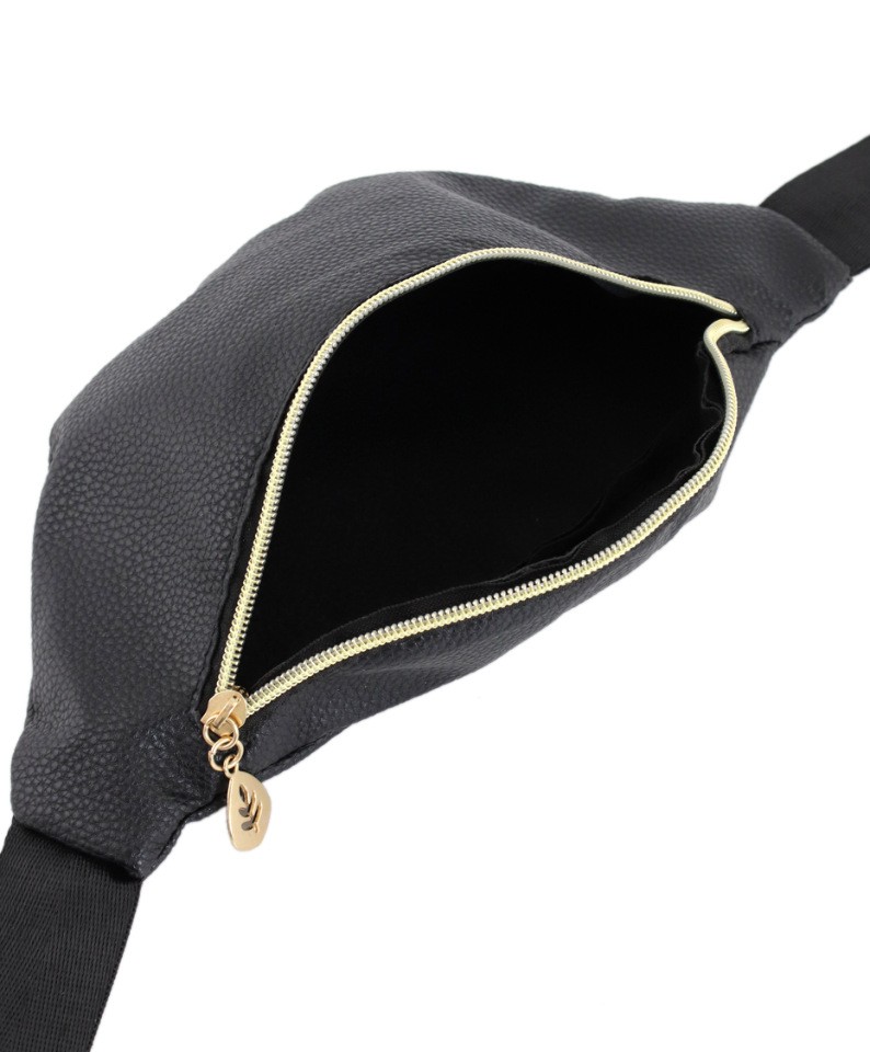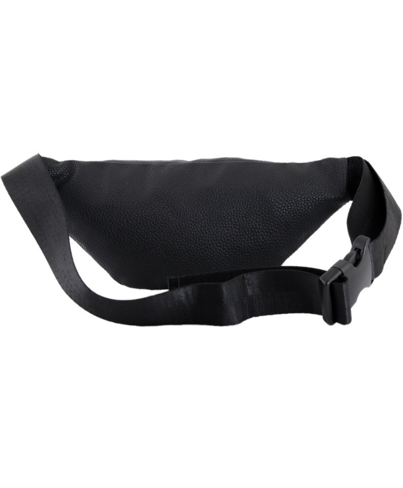 Сумка на пояс из искусственной кожи черного цвета, без подкладки. Основное отделение на молнии. Корсажный ремень на застежке.