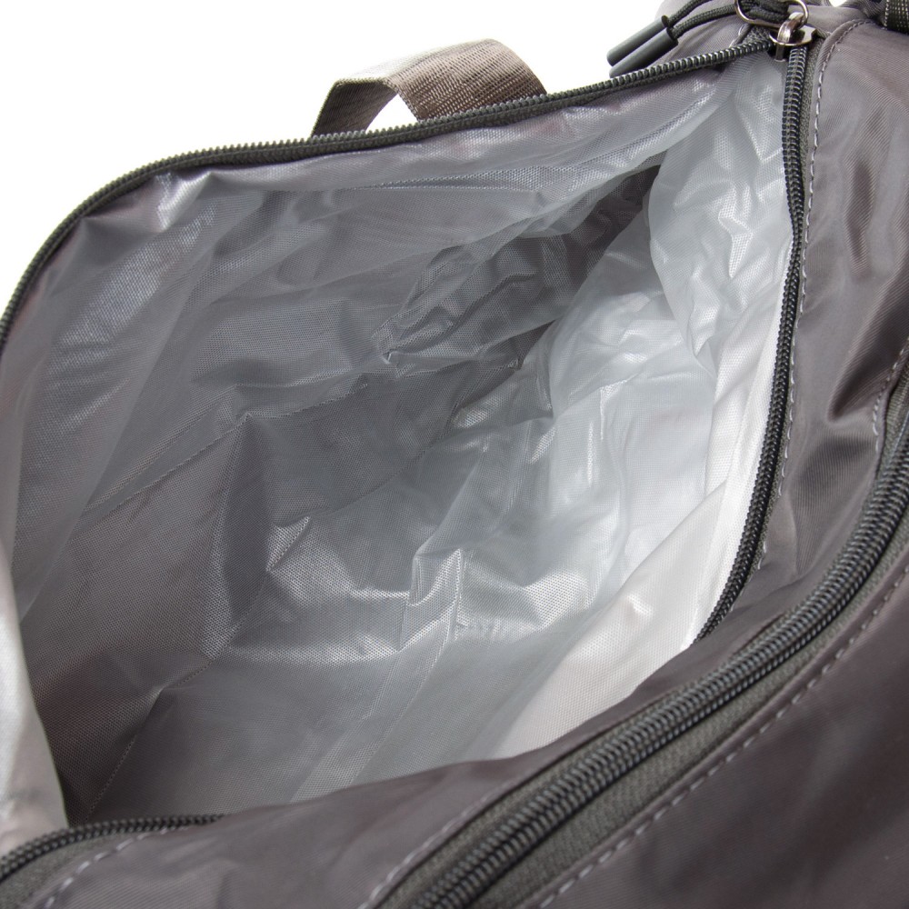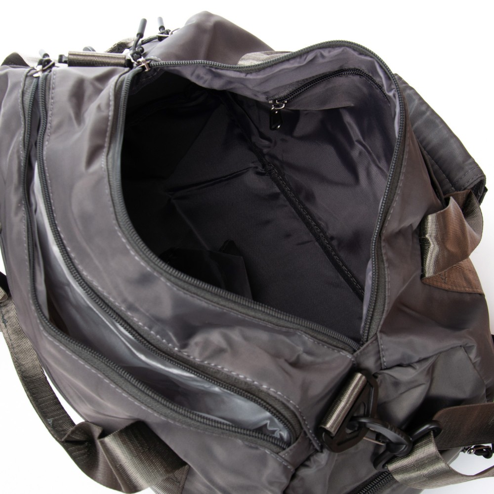 Количество отделов: 1 отделение, закрывается на молнию. Внутри отделения есть большой боковой карман на молнии. Снаружи также расположен большой карман-отделение на молнии с герметичной подкладкой. На фасаде находится один открытый карман. На обратной стороне есть крепление на ручку чемодана. На торцах сумки есть два кармана на молнии, один из которых предназначен для обуви.