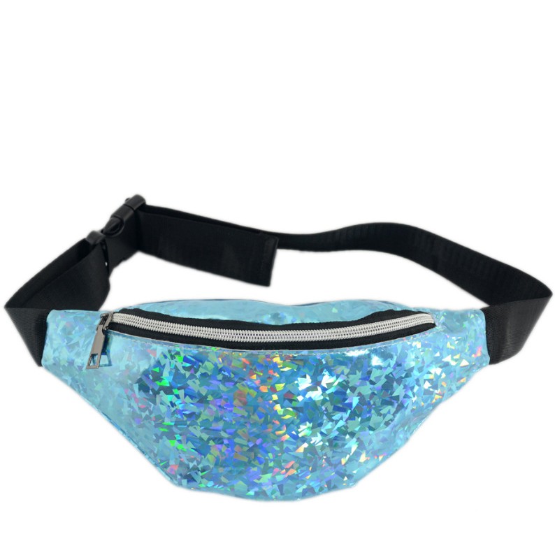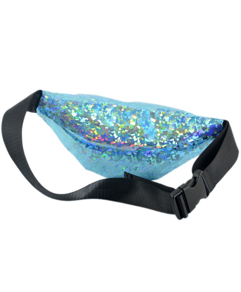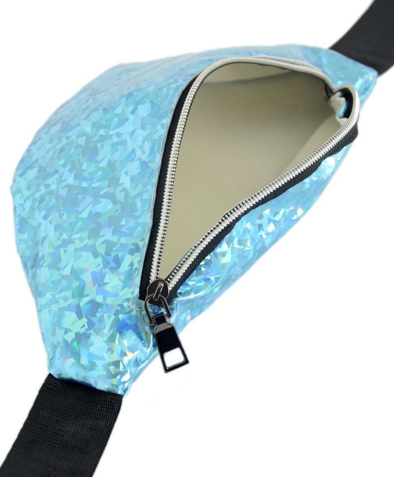 Сумка на пояс из кожзаменителя на тканевой основе с голографическим эффектом, голубого цвета. Корсажный ремень на застежке.
