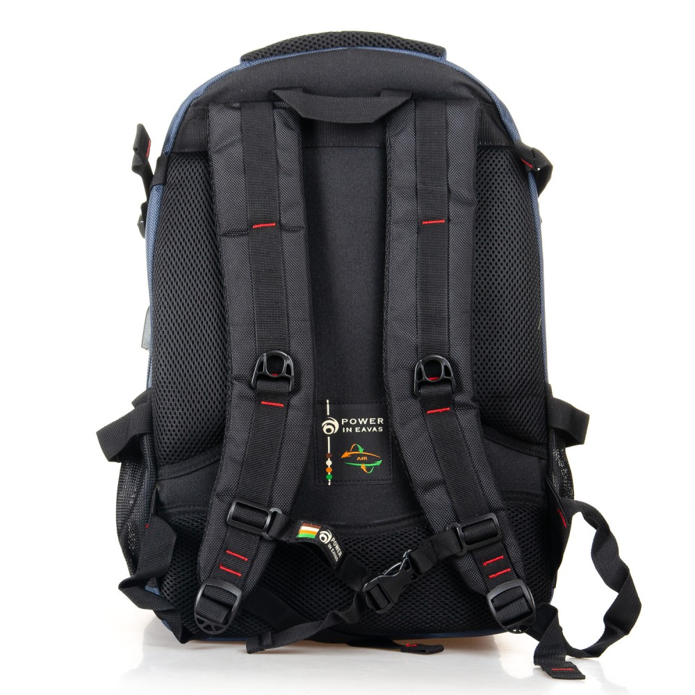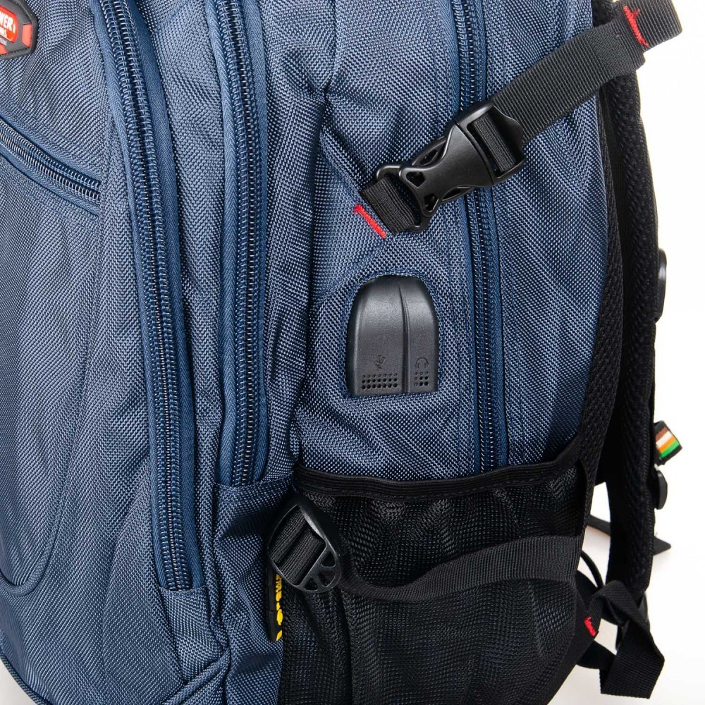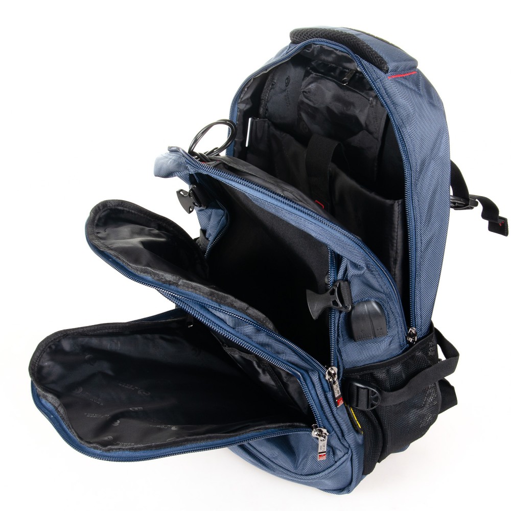 Внутри рюкзака находятся три отделения на молнии. В первом отделении расположен карман- органайзер, а в третьем отделении есть карман для ноутбука и карман для телефона. Также, из этого отделения выведены USB и кабель для наушников на внешнюю стенку рюкзака. На фасаде находится карман на молнии. Снаружи на боковых сторонах рюкзака расположены карманы-сетки для бутылок воды объемом 0,5 литров. Плечевые лямки регулируются по длине и оснащены грудным ремнем-стяжкой.