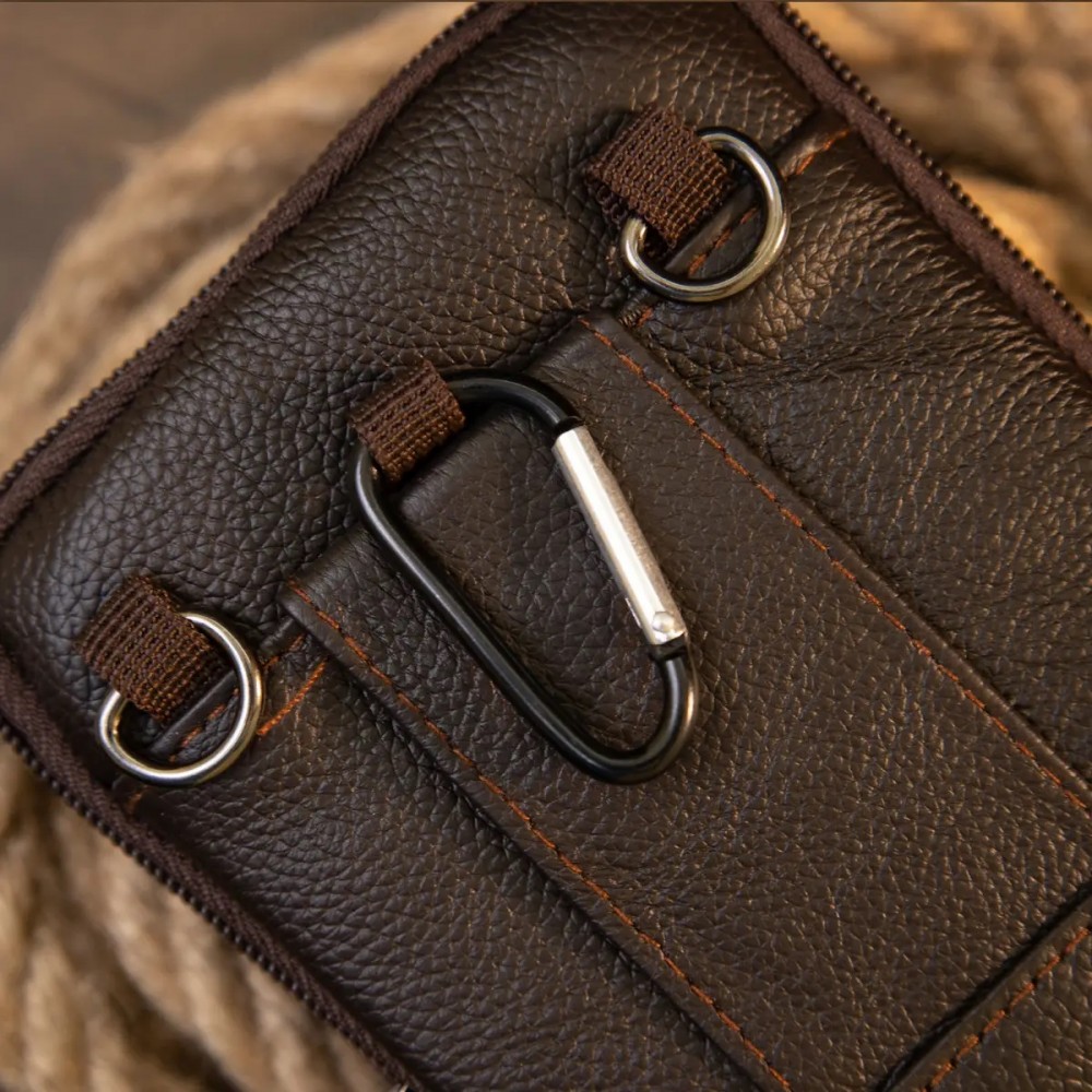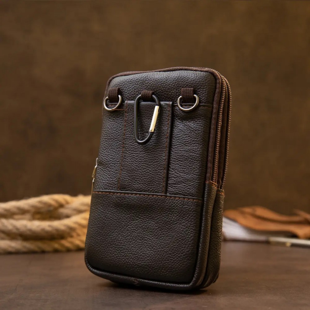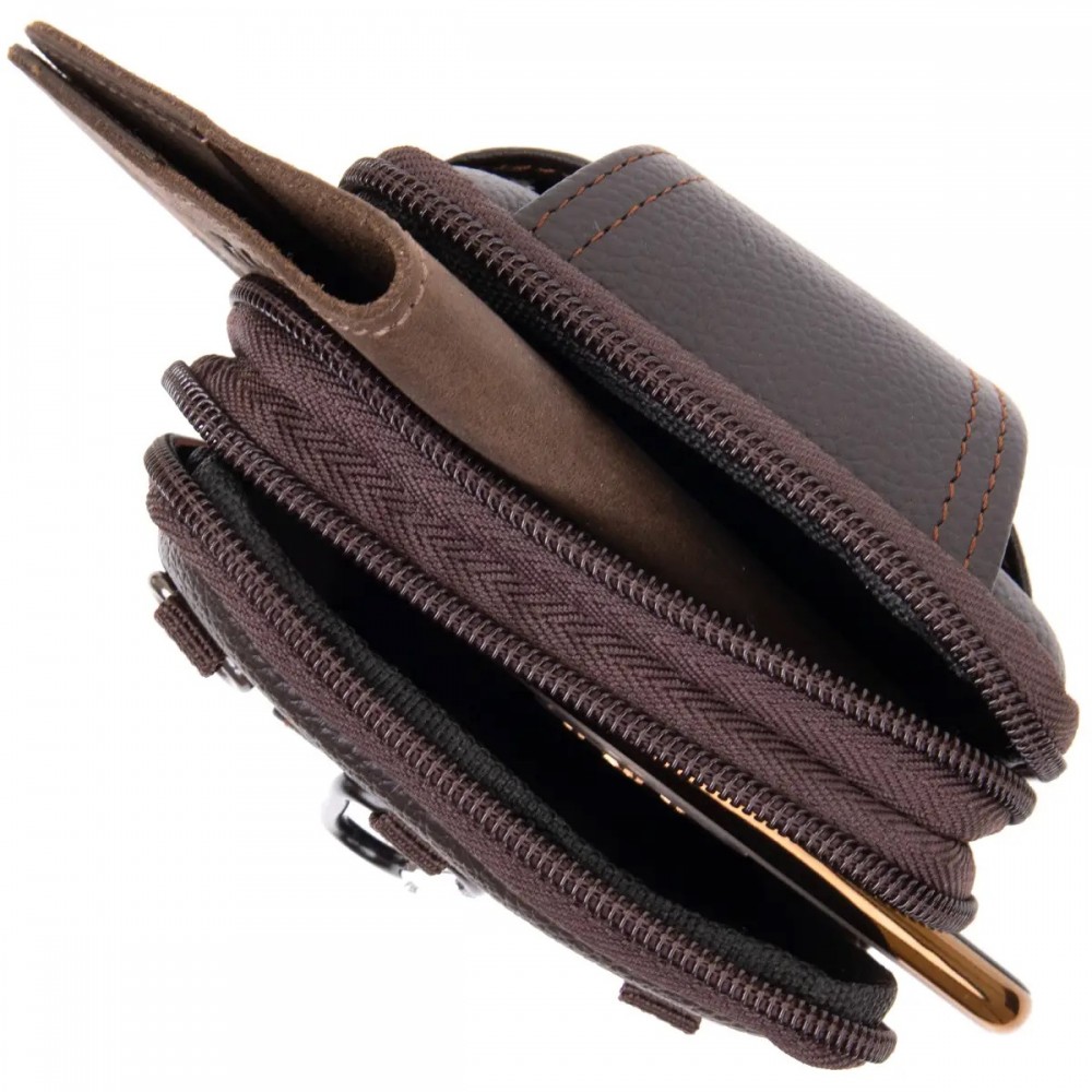 Количество отделов: 2 основных отделения. На лицевой стороне накладной карман с узким клапаном на магнитной кнопке и небольшой прорезной карман на молнии. На тыльной стороне - металлическое кольцо для карабина и петля для крепления к поясу.