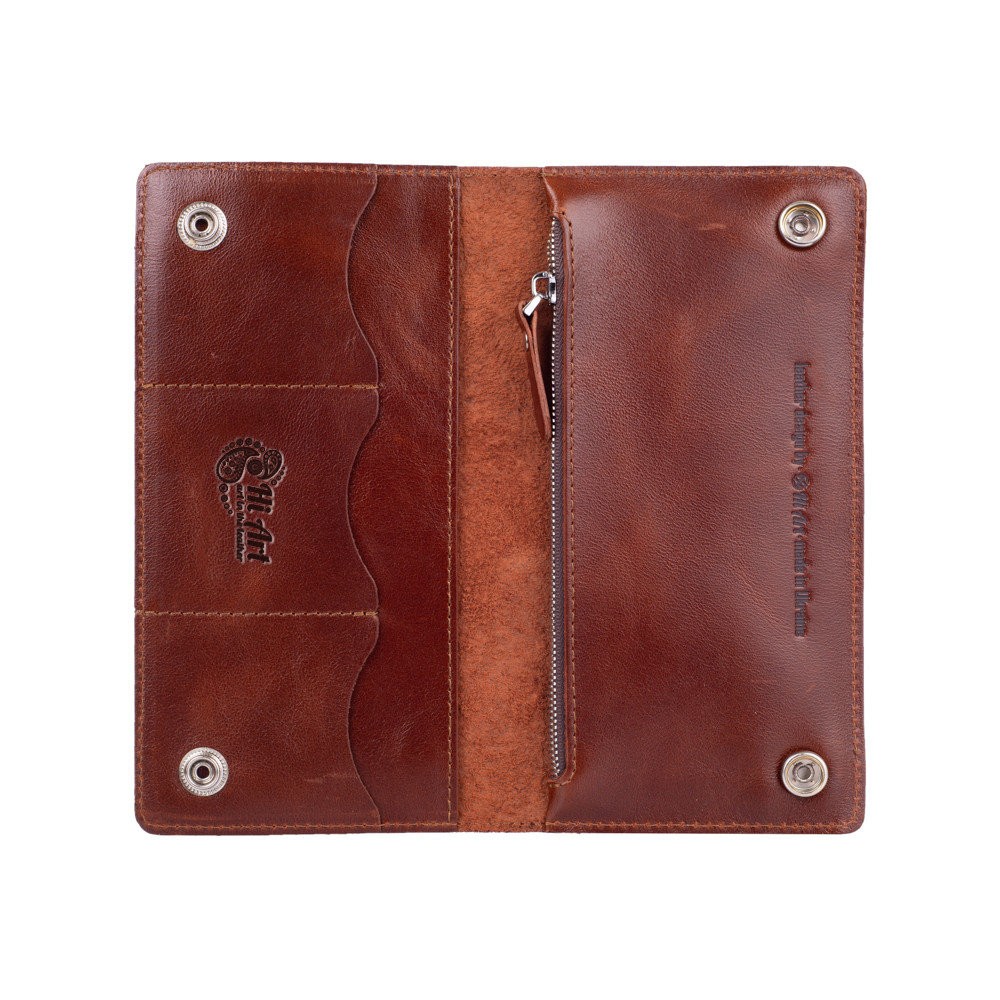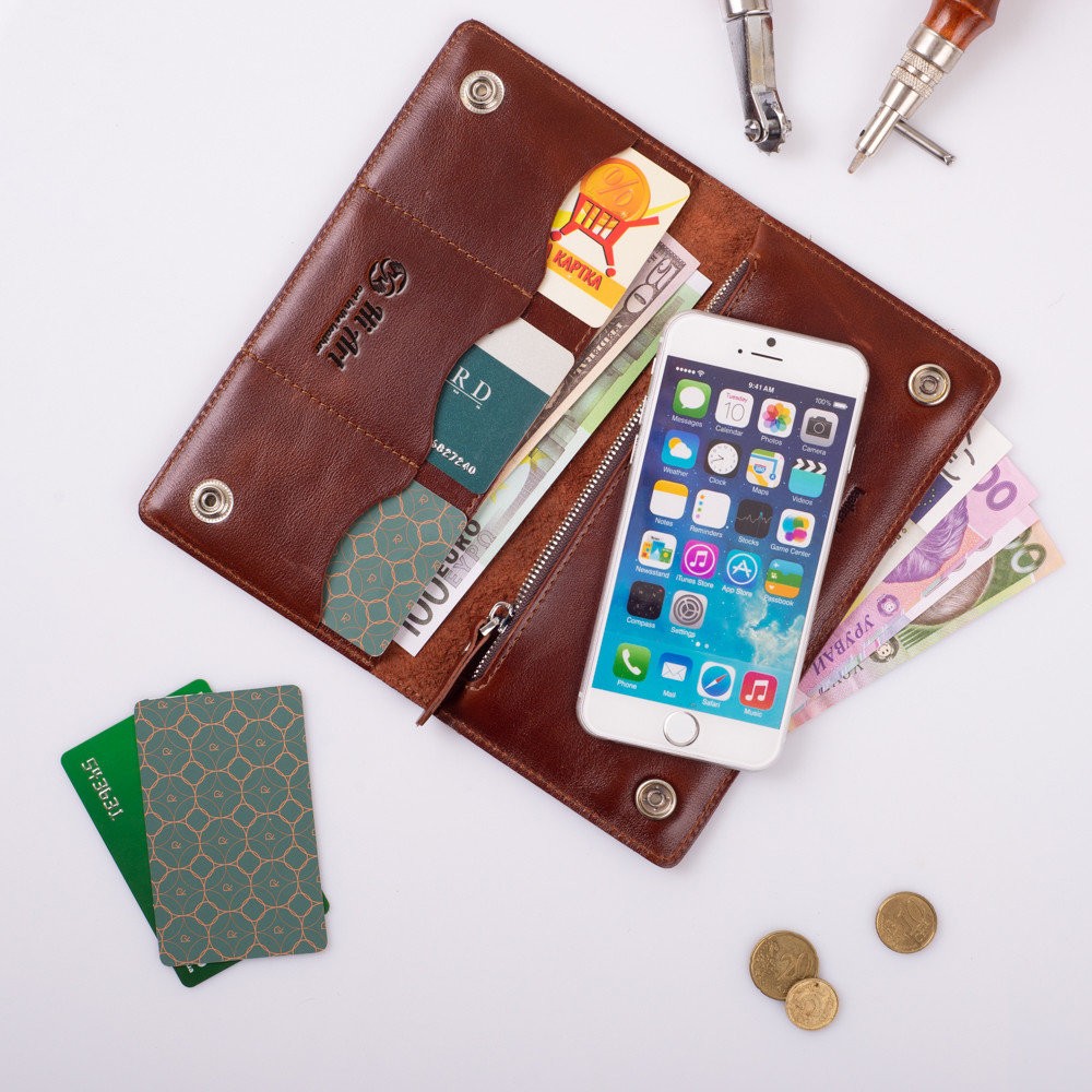 Эргономичный и стильный кошелек ручной работы из натуральной кожи на кнопках с художественным тиснением от HiArt , со всеми необходимыми отделами для купюр и мелочи. Будет отличным дополнением образа.