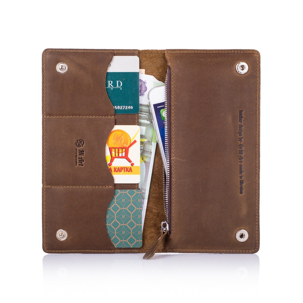 Эргономичный и стильный кошелек ручной работы из натуральной кожи на кнопках с художественным тиснением от HiArt , со всеми необходимыми отделами для купюр и мелочи. Будет отличным дополнением образа.