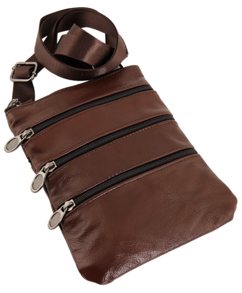 - Сумка-планшет из натуральной кожи коричневого цвета, на молнии. С внешней стороны- 4 кармана разной глубины на молнии. Регулируемый по длине корсажный ремень.