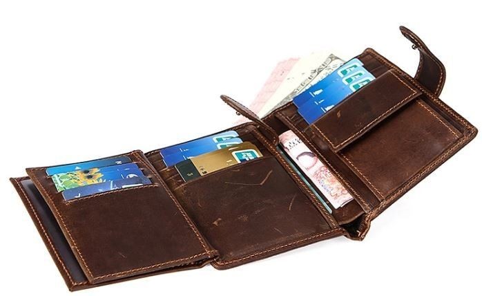 Количество отделов: 2 открытых кармана и один на молнии для купюр, карман на молнии, под хлястиком 3 слота под пленкой для фото или удостоверения, 11 ячеек для кредиток, монетница на кнопке.