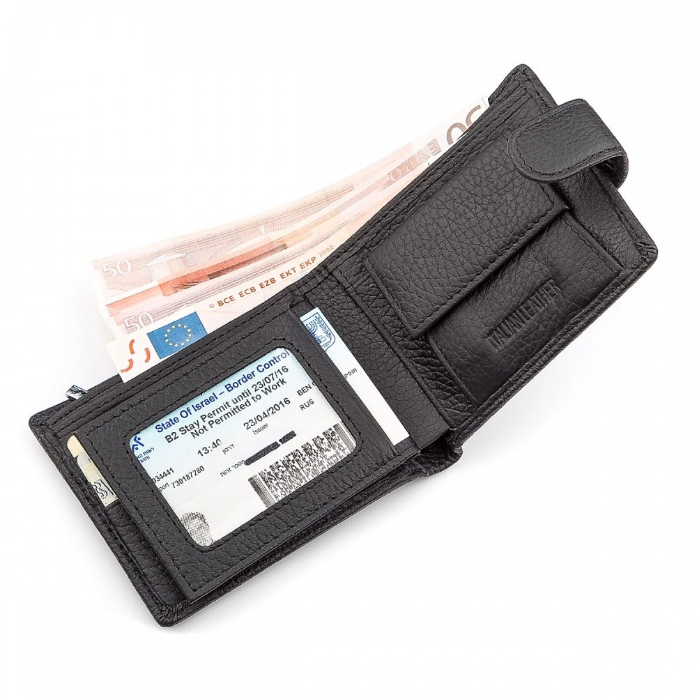 Количество отделов: 3 отделения для купюр (одно из которых на молнии), 5 слотов для пластиковых карт (2 из которых с прозрачным окошком для фото, пропуска или водительских прав), монетница на кнопке и 2 дополнительных кармана.