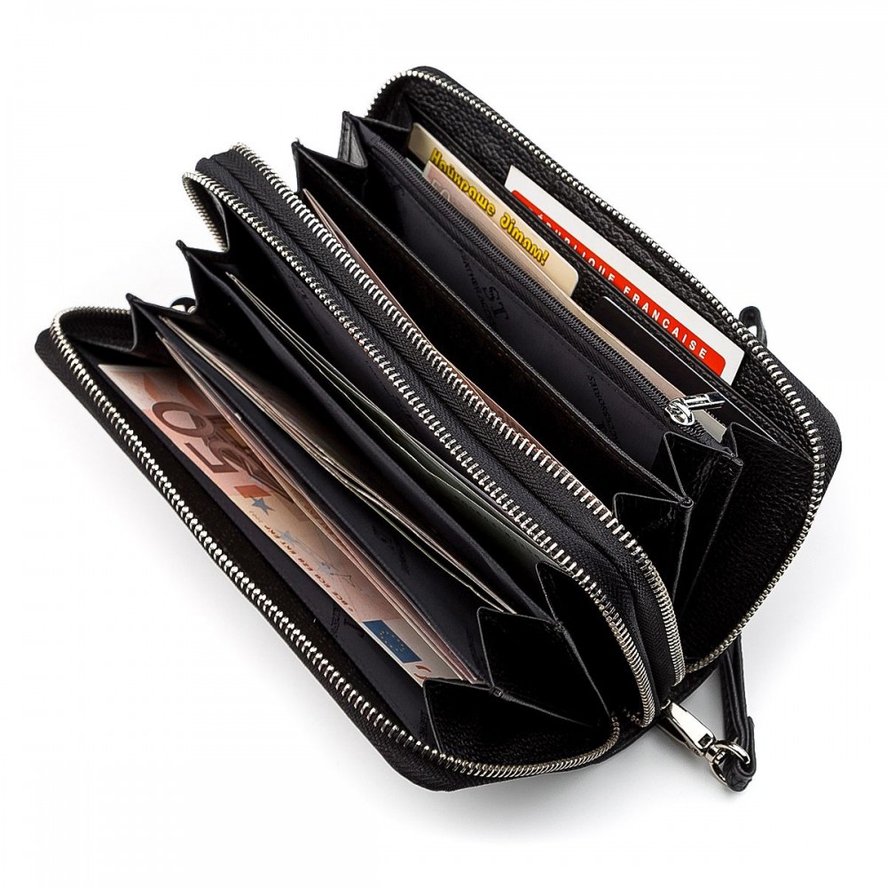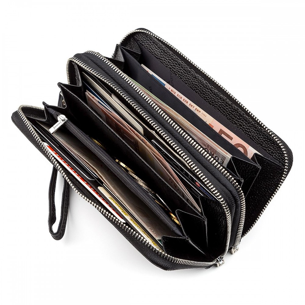 Количество отделов: 2 основных отделения. Внутри 9 отсеков для купюр, 8 слотов для пластиковых карт, карман-перегородка на молнии (монетница) и 4 дополнительных кармана.