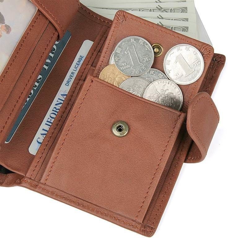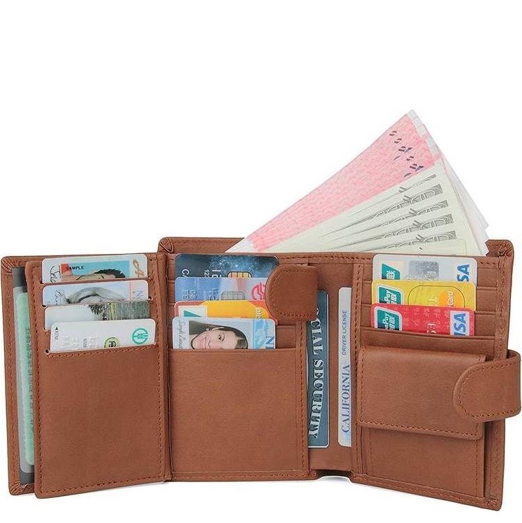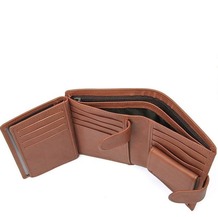Количество отделов: 3 отделения для купюр (одно из которых на молнии), монетница на кнопке, 14 слотов для пластиковых карт (3 из них с прозрачным окошком для фото или пропуска) и 2 дополнительных кармана.