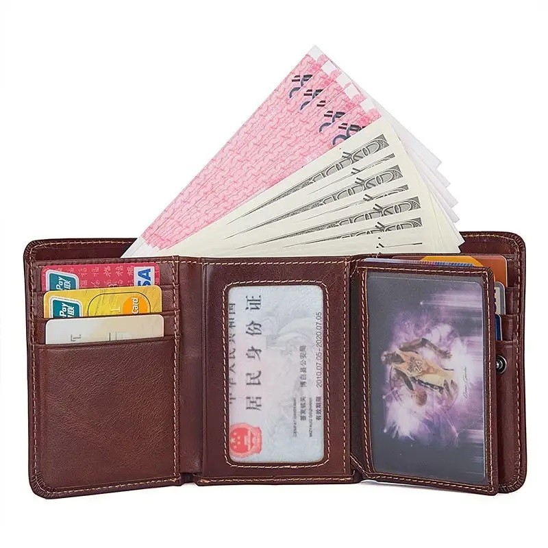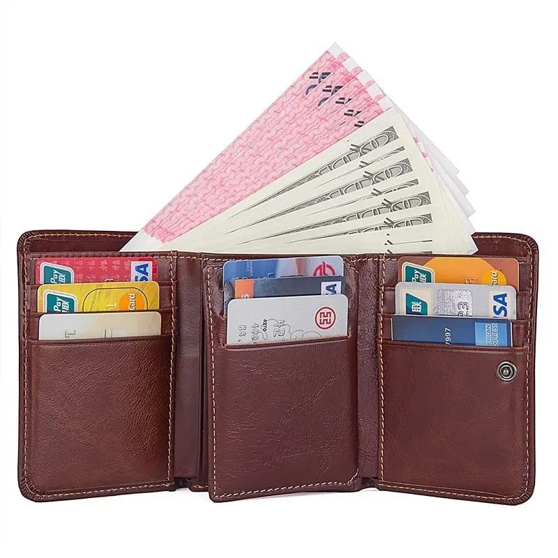 Количество отделов: отсек для купюр, 2 открытых кармана, 11 слотов для кредитных и дисконтных карт (2 из которых с прозрачным окошком для фото или водительского удостоверения), монетница на кнопке.