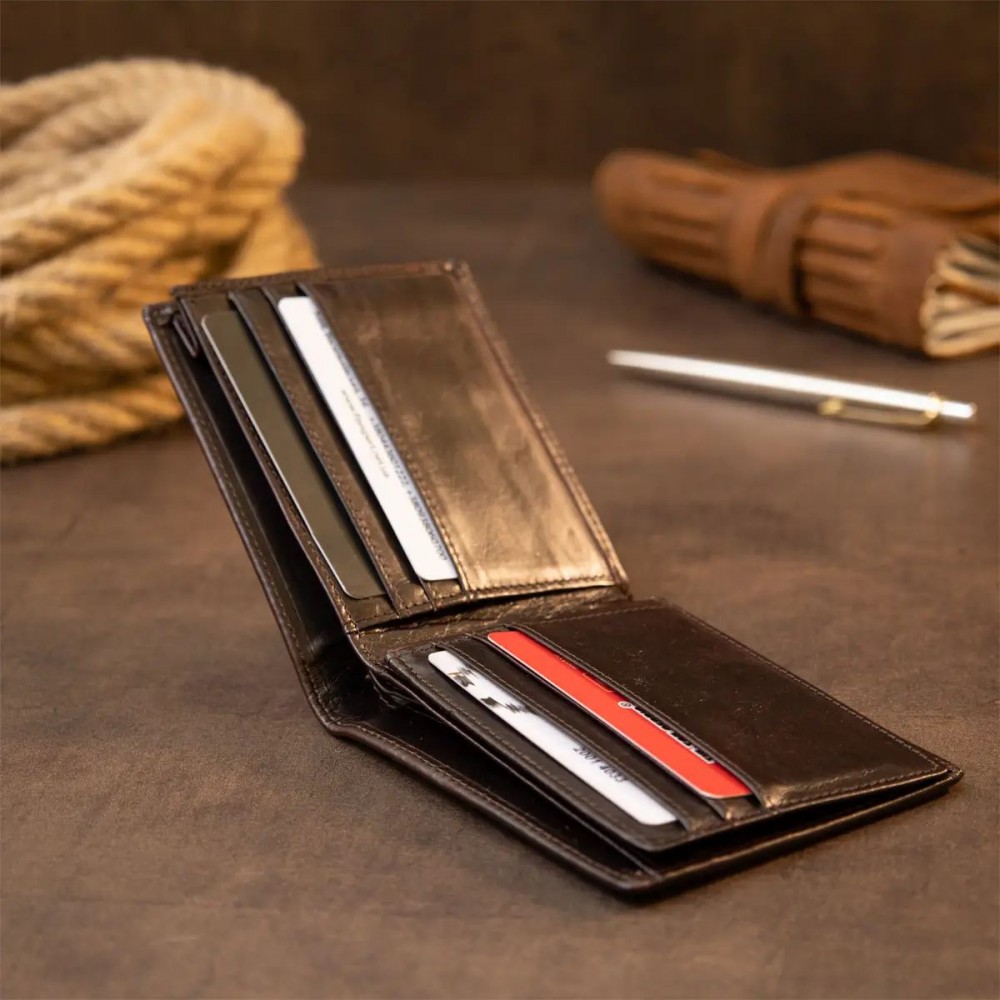 Количество отделов: 2 отделения для купюр; 10 ячеек для кредиток (одна под пленкой); 3 открытых кармана;
