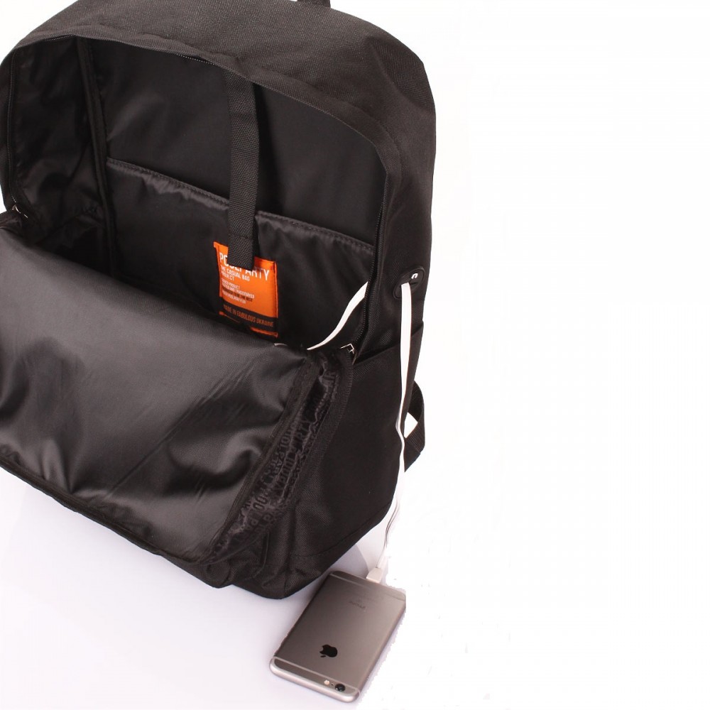 Особенности: мягкая спинка, лямки регулируемой длины и удобная ручка-петля для ношения в руке. Сбоку есть прорезиненный выход для наушников и power bank.