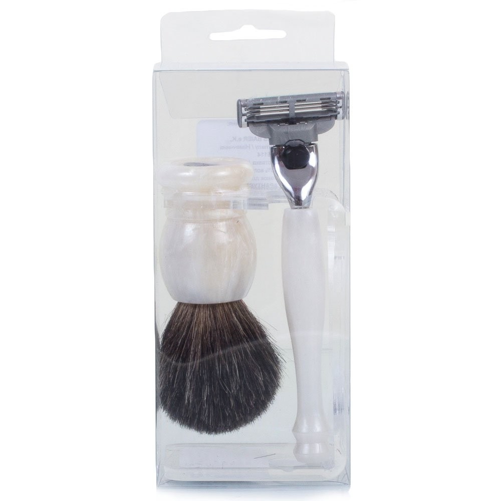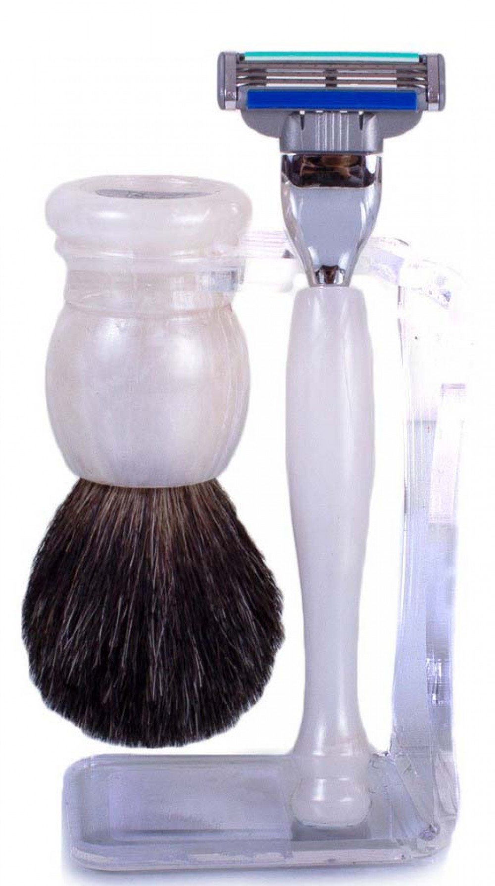Материал ручки помазка и бритвенного станка: пластик (под белый оникс); подставка - прозрачный пластик