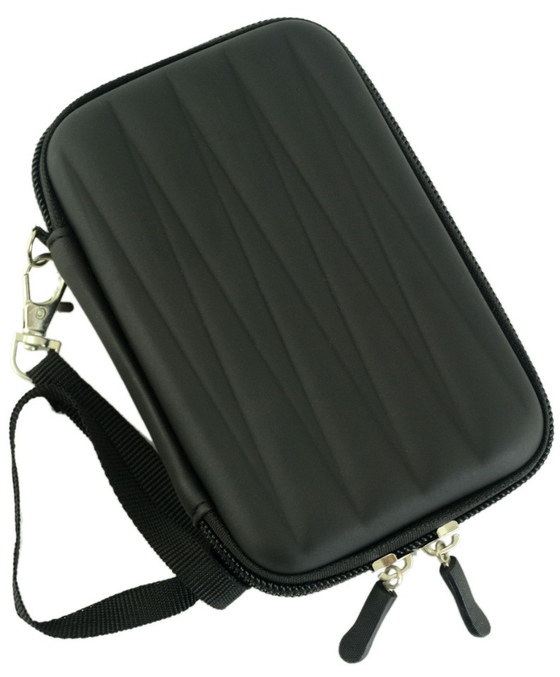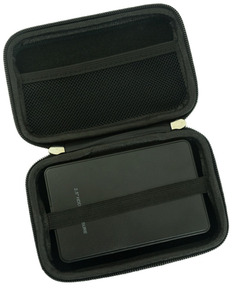 Чехол для жесткого диска черного цвета, на молнии. Внутри: сеточный карман и резинка-держатель. Ручка-петля на карабине.