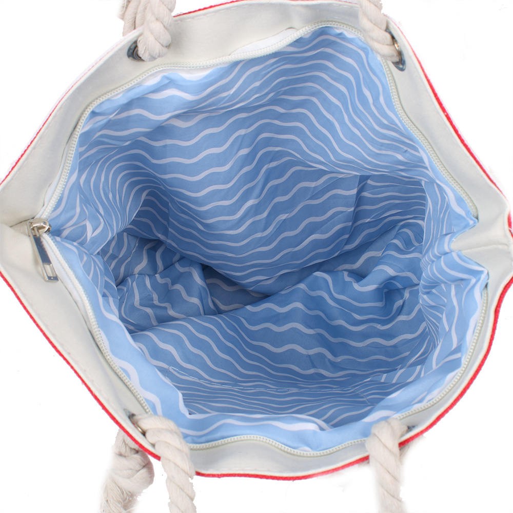 Особенности: ручки изготовлены из плетеного каната, крепятся к сумке при помощи металлических люверсов и больших узлов.