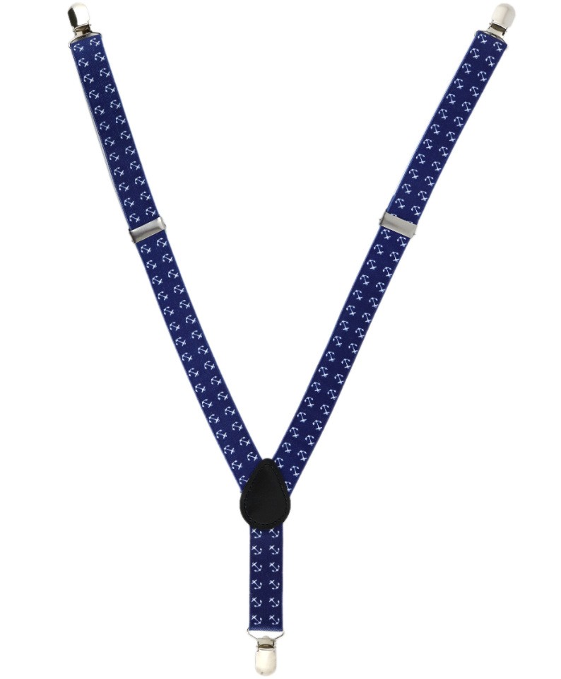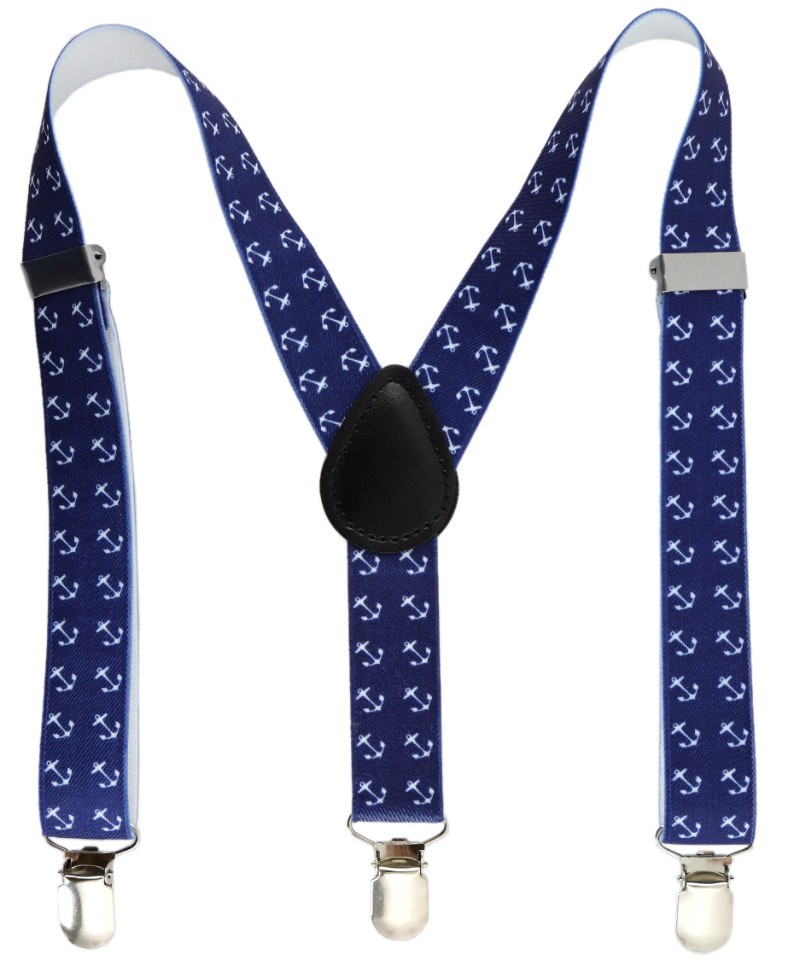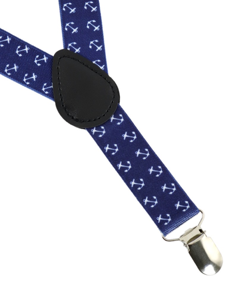 Детские подтяжки синего цвета в белые якоря. Для детей ростом до 160 см. Регулируемая длина
