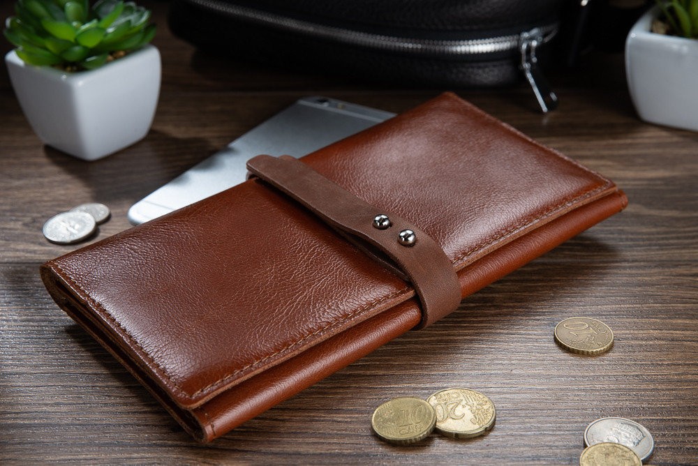 Эргономичный и стильный кошелек ручной работы из натуральной кожи на кнопках с художественным тиснением от HiArt , со всеми необходимыми отделами для купюр и мелочи. Будет отличным дополнением образа.