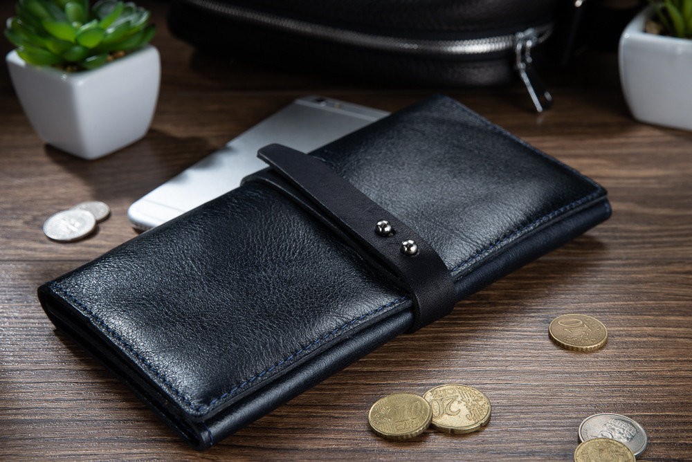 Эргономичный и стильный кошелек ручной работы из натуральной кожи на кнопках с художественным тиснением от HiArt , со всеми необходимыми отделами для купюр и мелочи. Будет отличным дополнением образа.