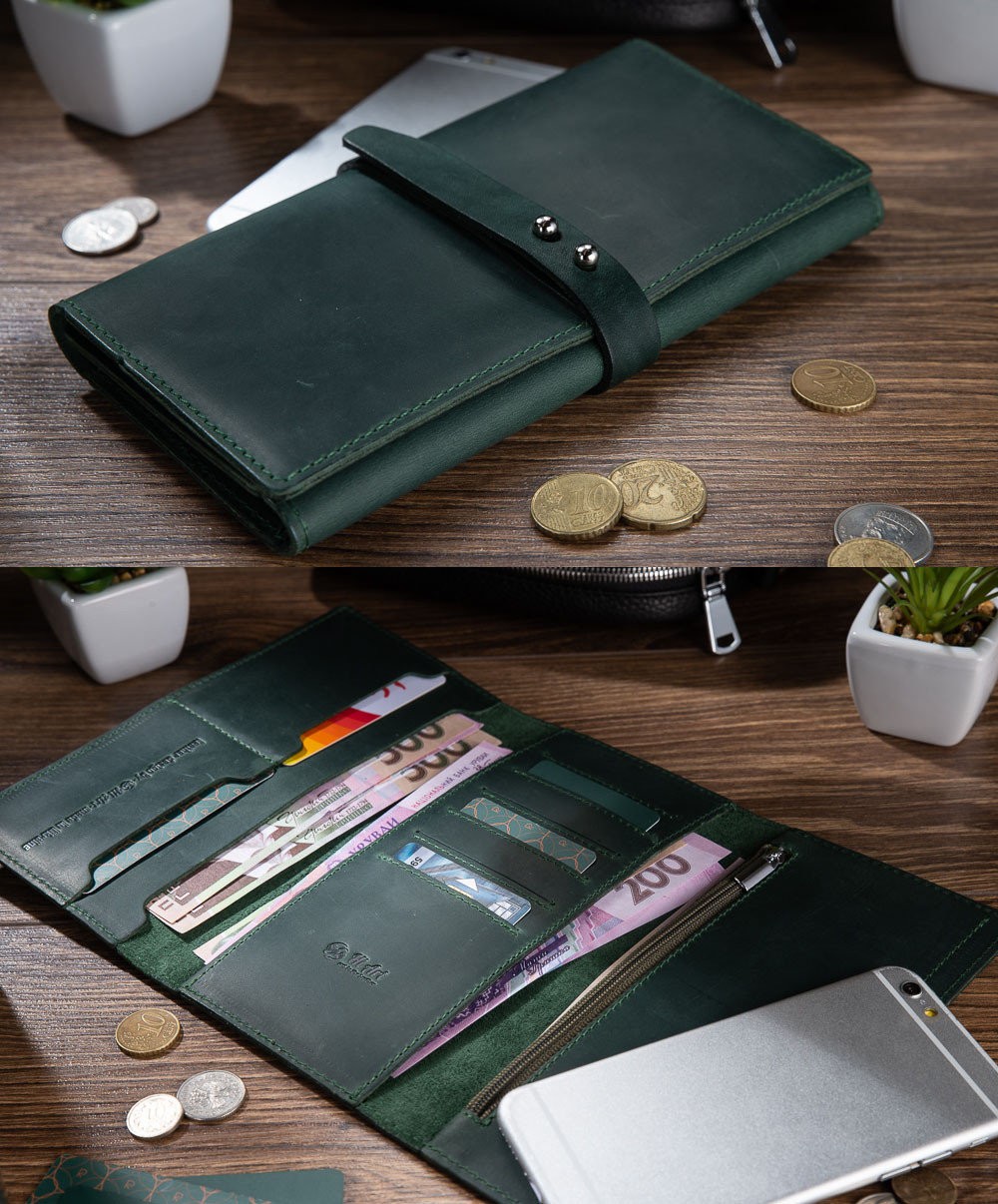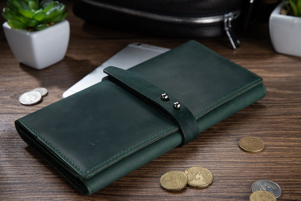 Эргономичный и стильный кошелек ручной работы из натуральной кожи на кнопках с художественным тиснением от HiArt , со всеми необходимыми отделами для купюр и мелочи. Будет отличным дополнением образа.