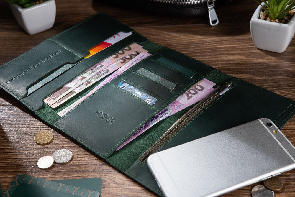 Количество отделов: 2 больших отдела для купюр и мобильного телефона; 8 отделений для карт, монетница на молнии. Каждый карман выполнен с подкладом (карты не проваливаются).