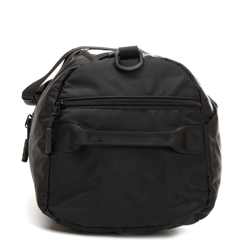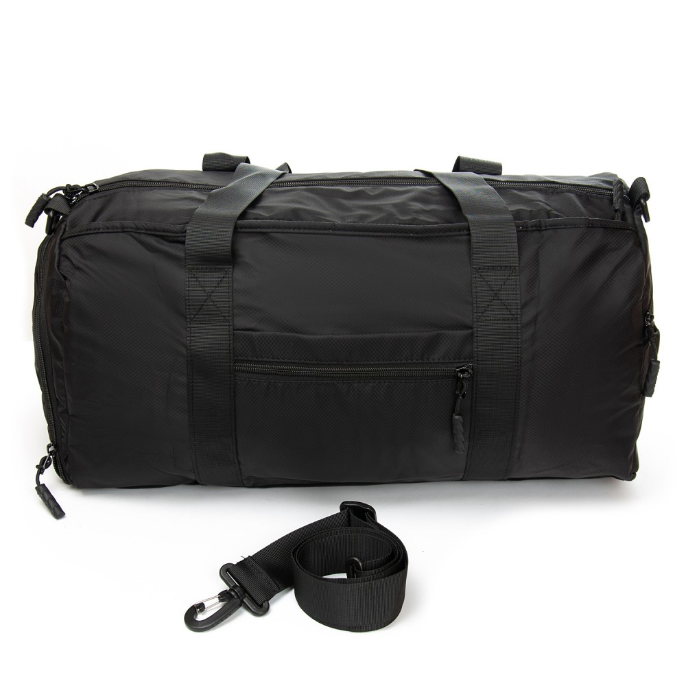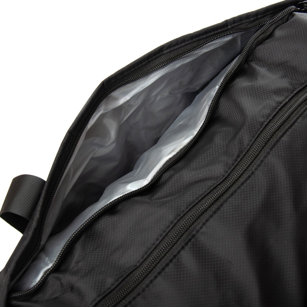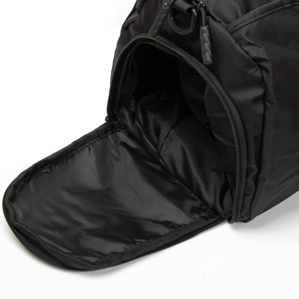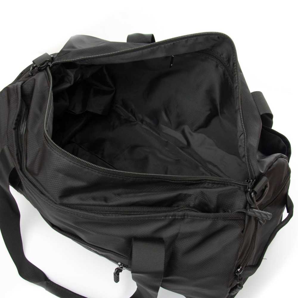 Количество отделов: 1 отделение, закрывается на молнию. Внутри отделения есть большой боковой карман на молнии. Снаружи также расположен большой карман-отделение на молнии с герметичной подкладкой. На фасаде находятся три открытых кармана. На обратной стороне расположен карман на молнии и крепление на ручку чемодана. На торцах сумки есть два кармана на молнии, один из которых предназначен для обуви.