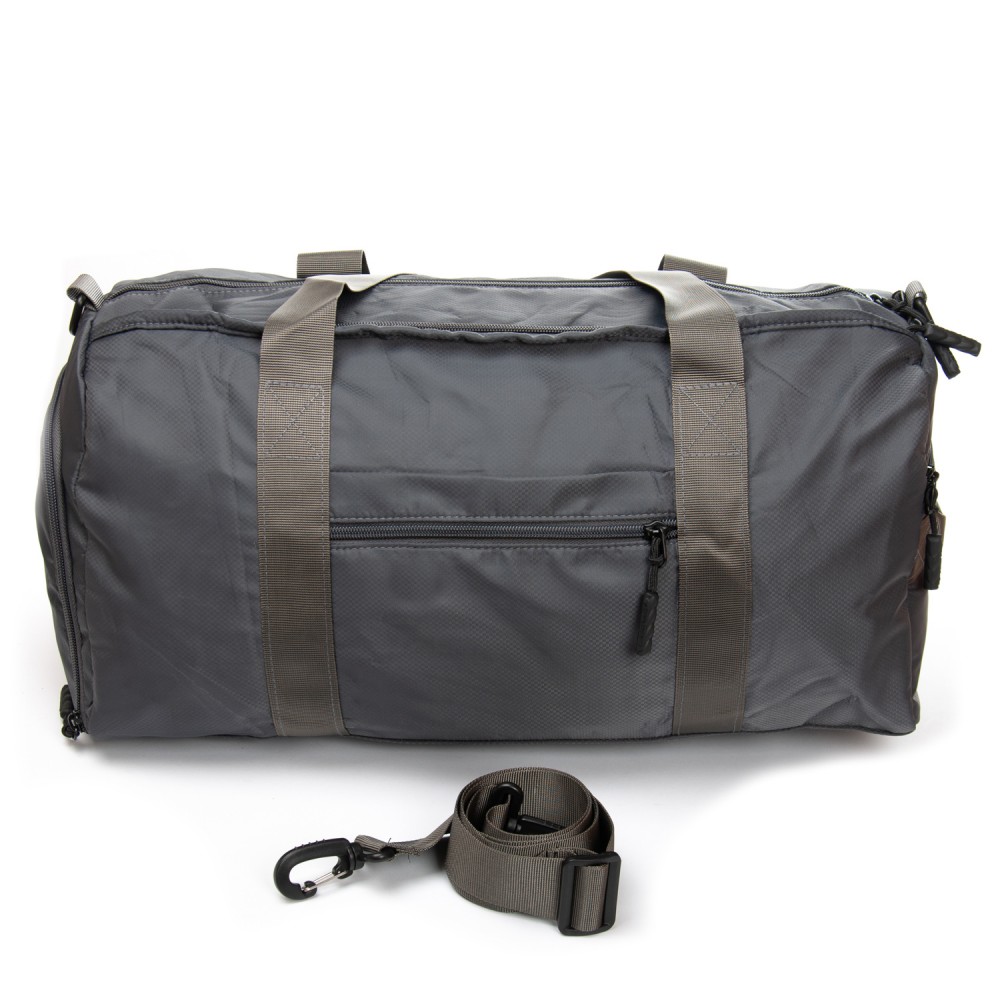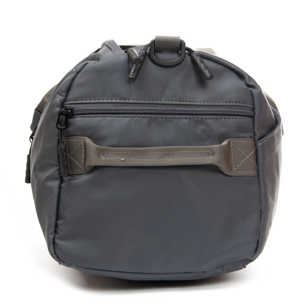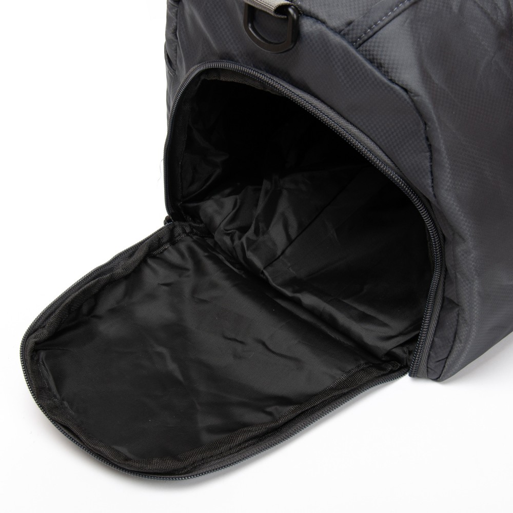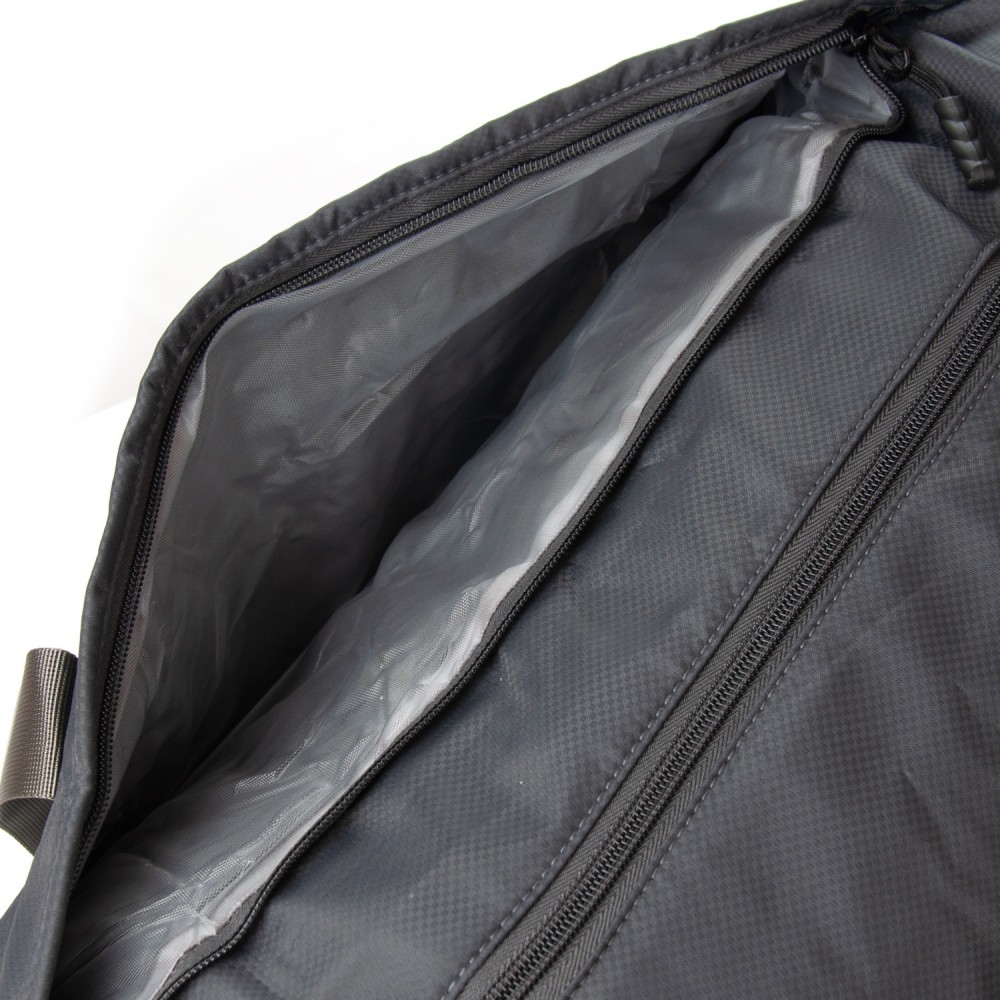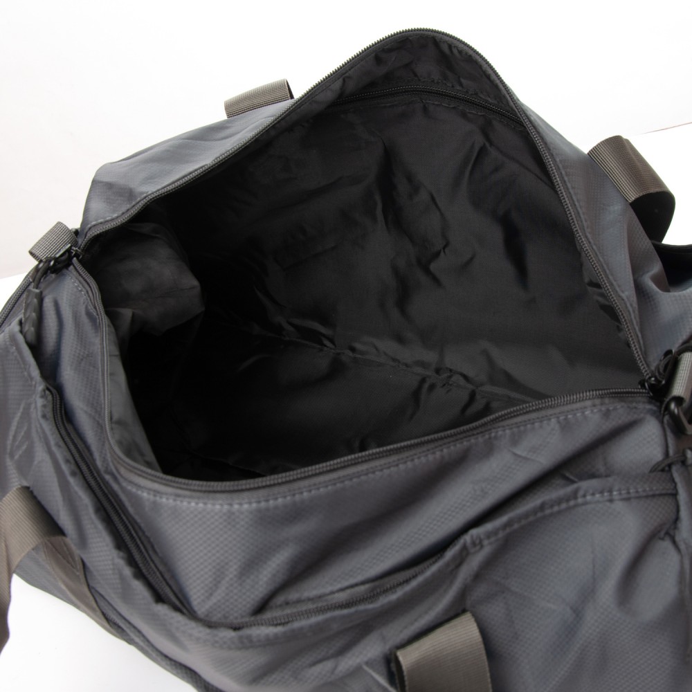 Количество отделов: 1 отделение, закрывается на молнию. Внутри отделения есть большой боковой карман на молнии. Снаружи также расположен большой карман-отделение на молнии с герметичной подкладкой. На фасаде находятся три открытых кармана. На обратной стороне расположен карман на молнии и крепление на ручку чемодана. На торцах сумки есть два кармана на молнии, один из которых предназначен для обуви.