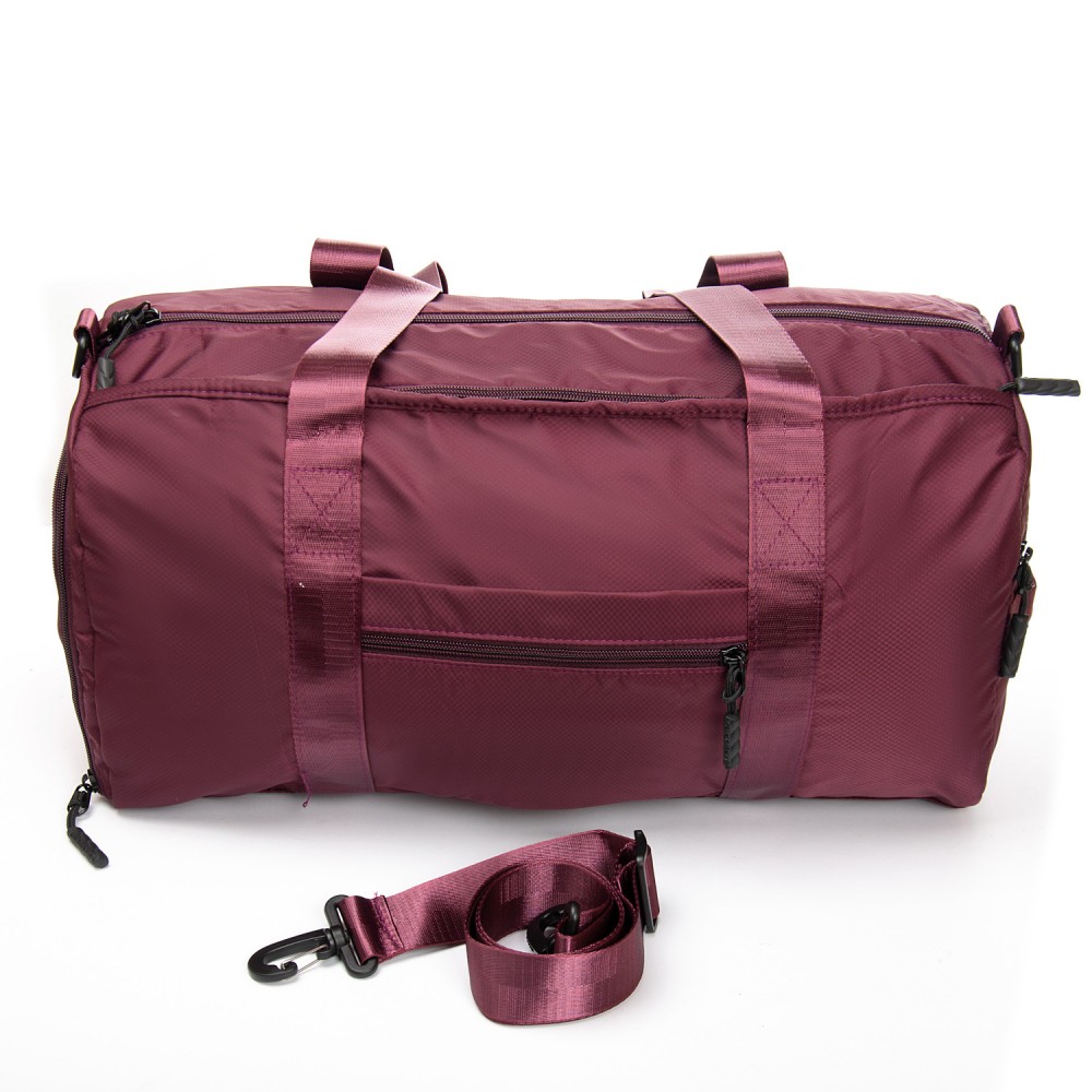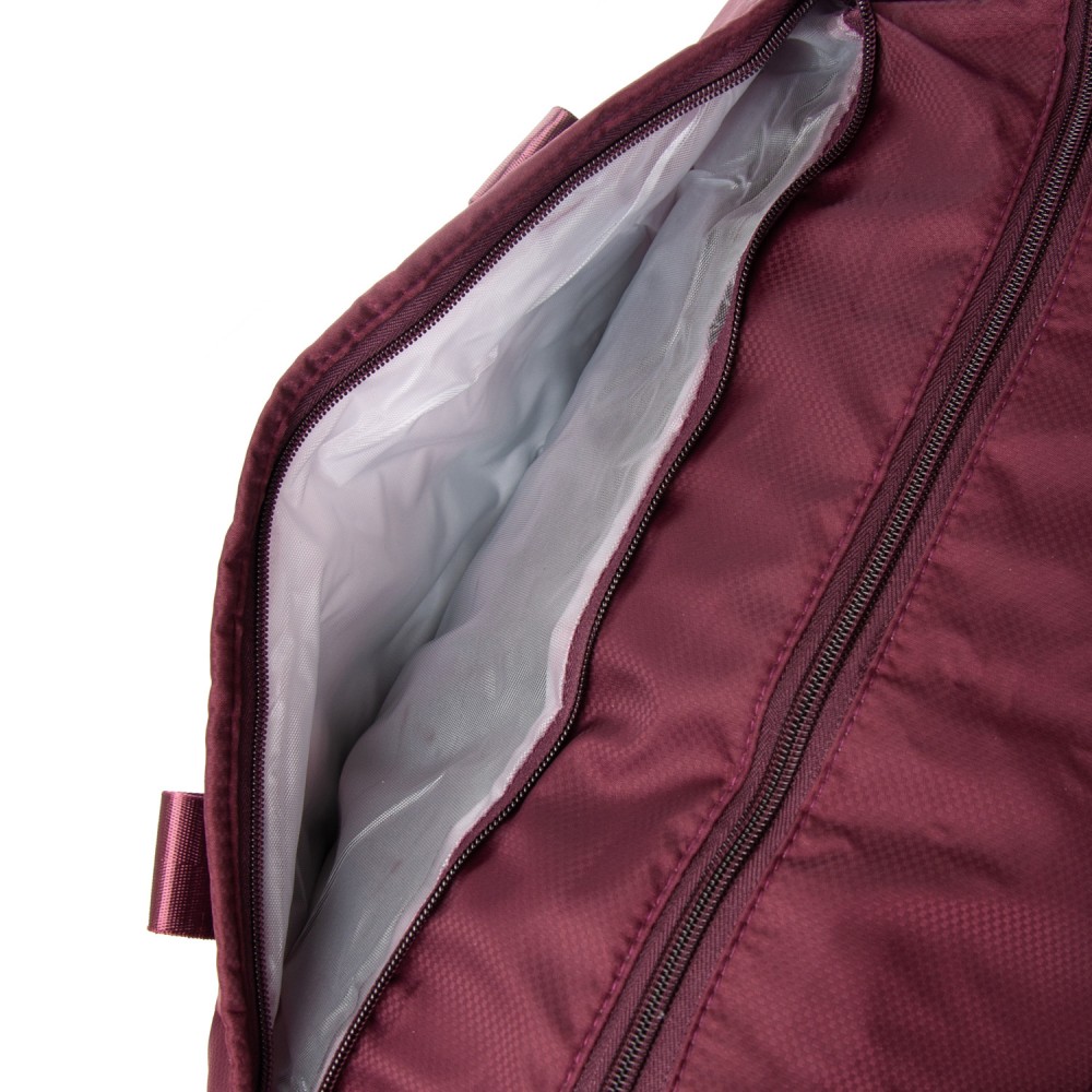 Количество отделов: 1 отделение, закрывается на молнию. Внутри отделения есть большой боковой карман на молнии. Снаружи также расположен большой карман-отделение на молнии с герметичной подкладкой. На фасаде находятся три открытых кармана. На обратной стороне расположен карман на молнии и крепление на ручку чемодана. На торцах сумки есть два кармана на молнии, один из которых предназначен для обуви.