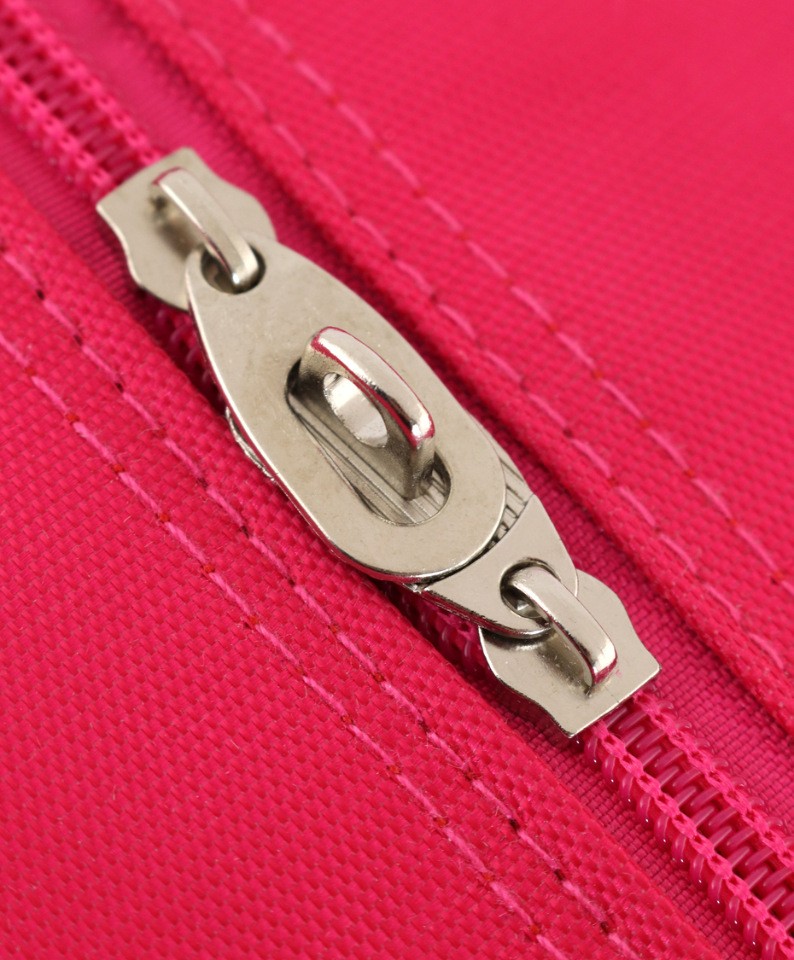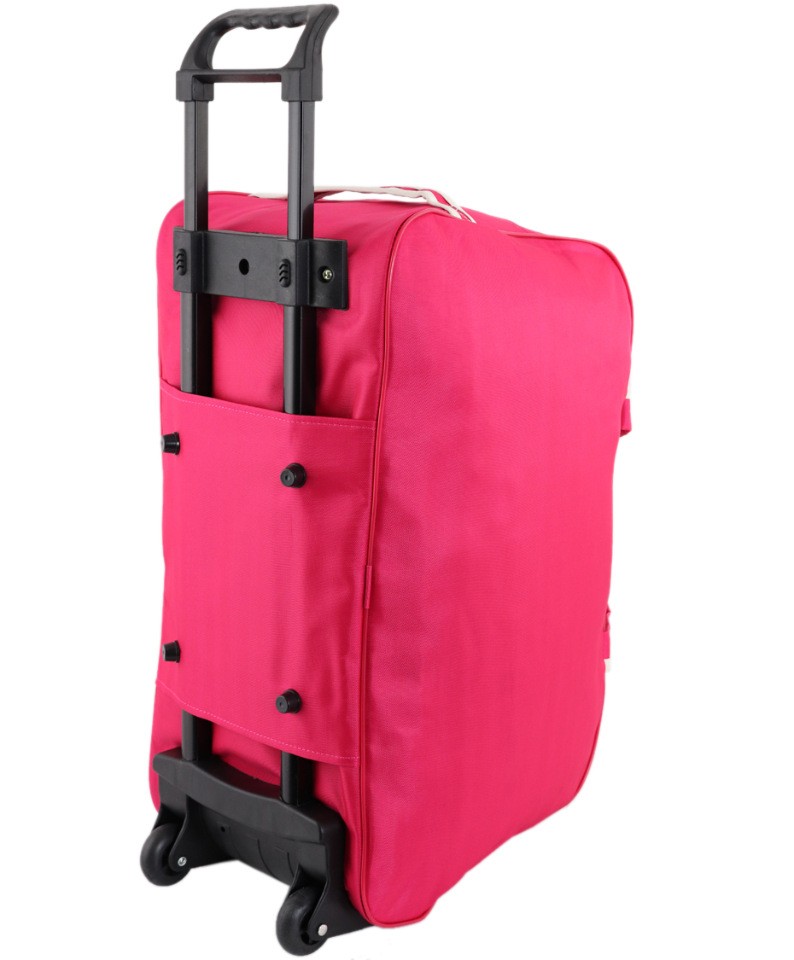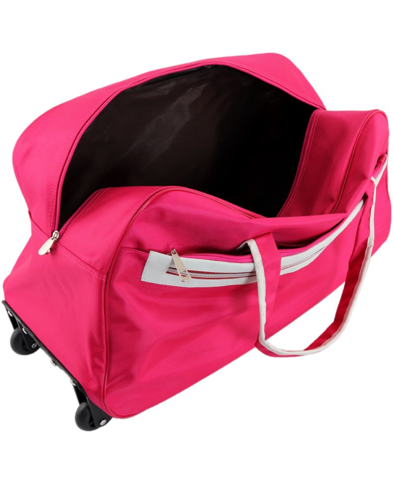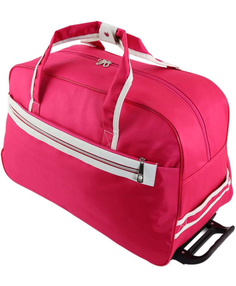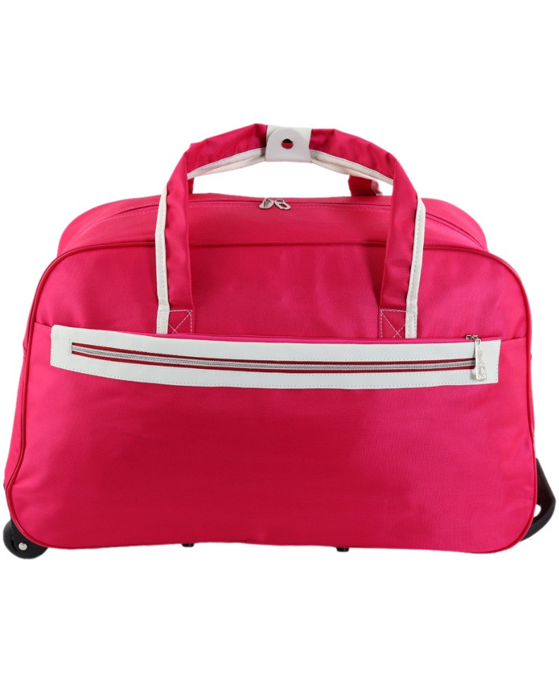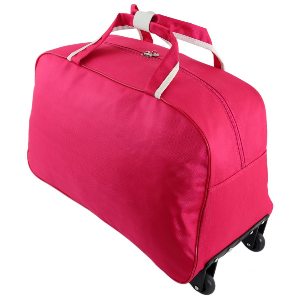 Дорожная сумка из плотного нейлона малинового цвета, на колесах (пластик). Одно большое отделение на молнии. С лицевой стороны на всю длину сумки большой карман на молнии. Выдвижная ручка высотой (от пола) 1м. Ручки средней длинны.
