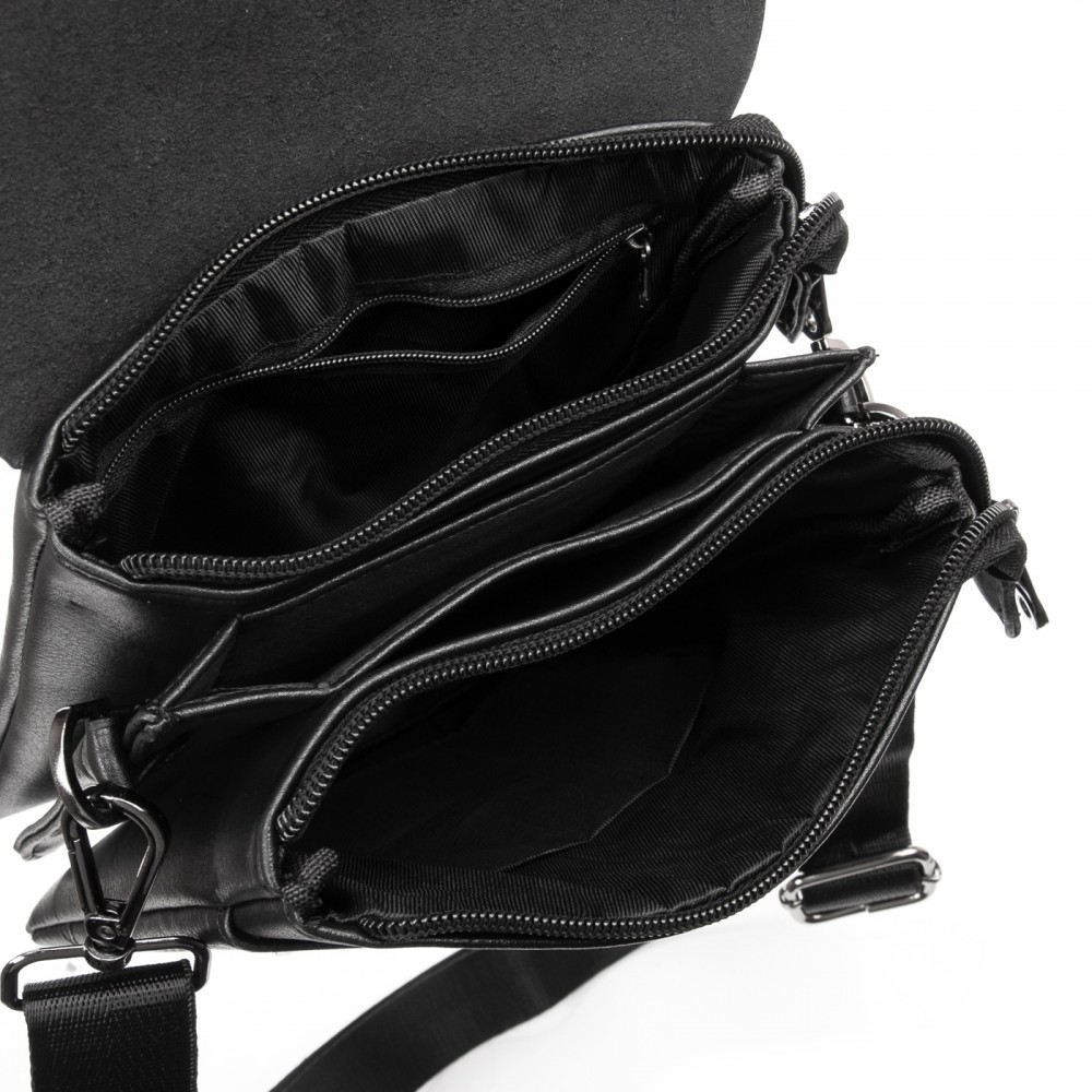 Количество отделений: 2 отделения, которые дополнительно закрываются на молнии. Отделения разделены карманом-перегородкой. На фасаде под клапаном расположен большой открытый карман. На обратной стороне сумки есть карман на молнии.