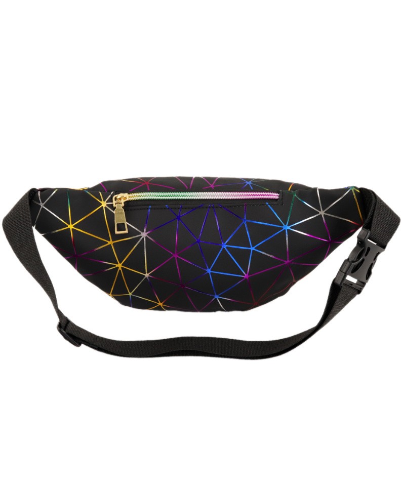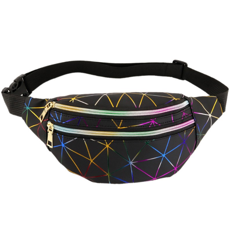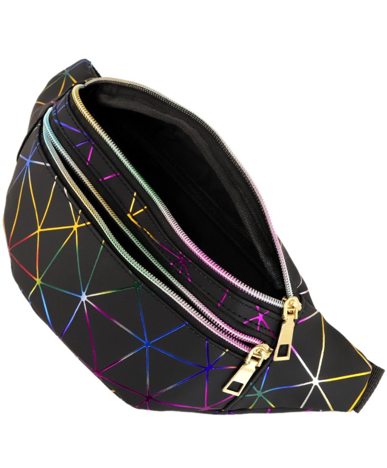Сумка на пояс черного цвета с разноцветными геометрическими узорами. 3 отделения на молнии. Корсажный регулируемый по длине ремень на застежке.
