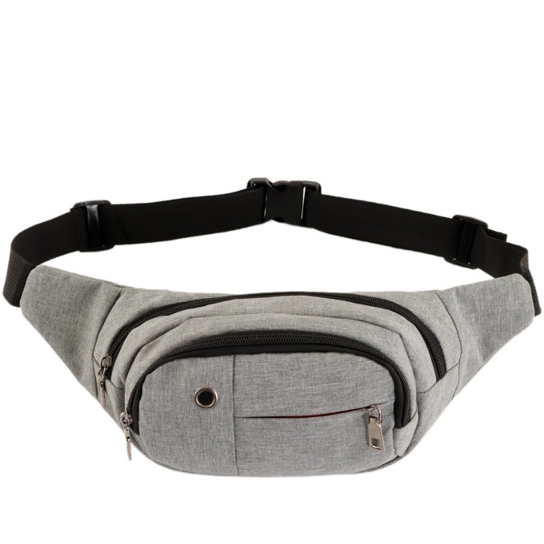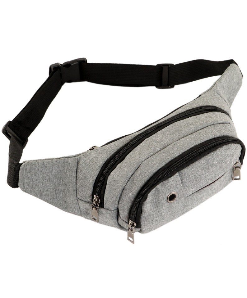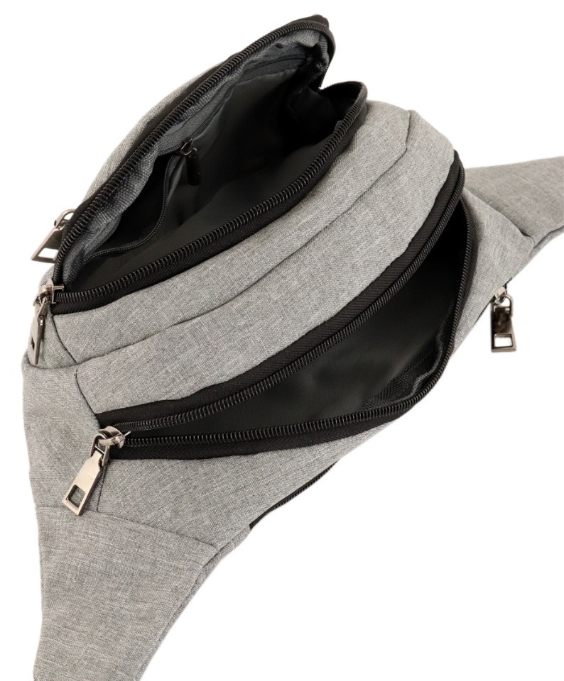 Сумка на пояс из плотной ткани серого цвета (меланж). Имеет: 3 отделения на молнии; с лицевой стороны- выход для наушников и маленький кармашек. Регулируемый корсажный ремень.