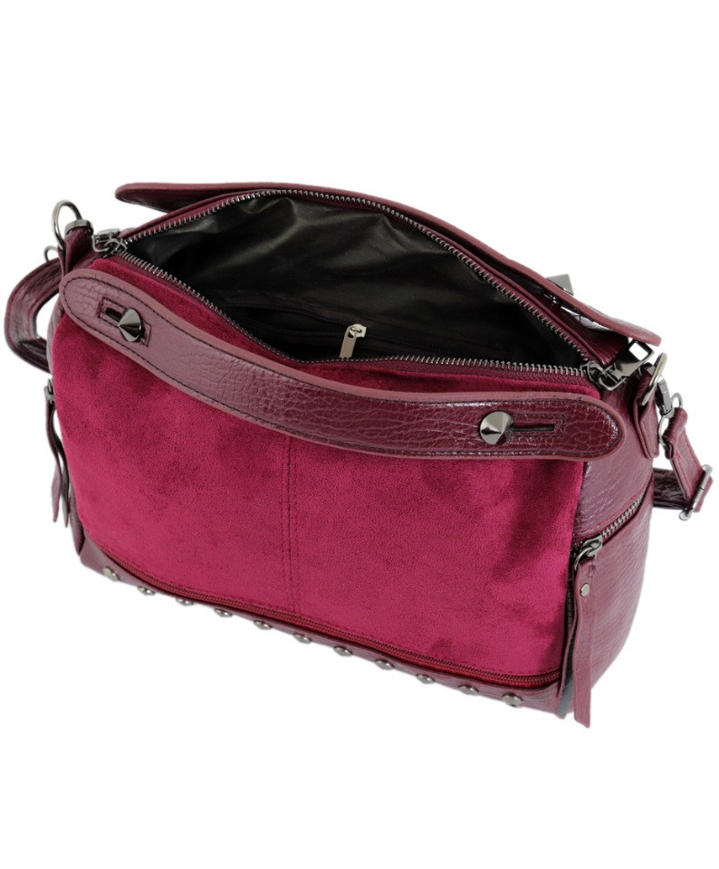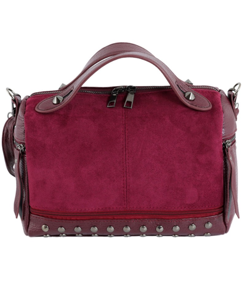 Сумка из мягкой искусственной кожи бордового цвета, с лицевой стороны- искусственный замш. Закрывается на молнию, внутри: 3 кармашка, 1- на молнии. С тыльной стороны и боковые карманы- на молнии. Короткие ручки и ремешок на карабинах.