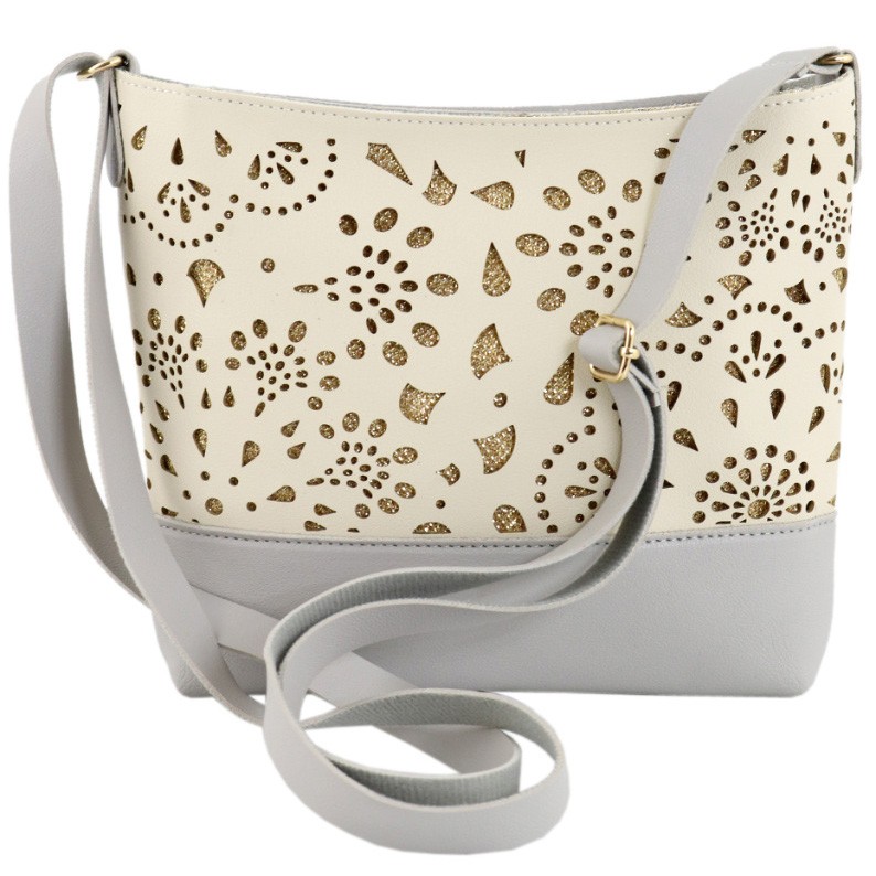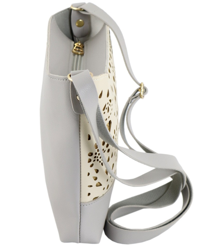 Комбинированная сумочка с перфорацией, на молнии; без подкладки. Цвет: молочный с серым.
