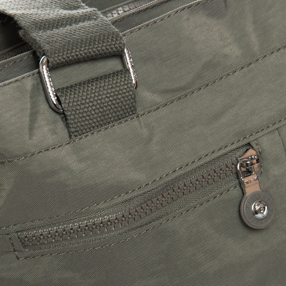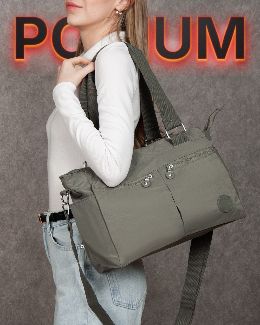 Три отделения: центральное закрывается на молнию, а боковые на магнитную кнопку. Внутри центрального отделения находятся большой боковой карман на молнии и открытый двойной карман. На фасаде и обратной стороне сумки находятся карманы на молнии. А на торцах есть открытые небольшие карманы.