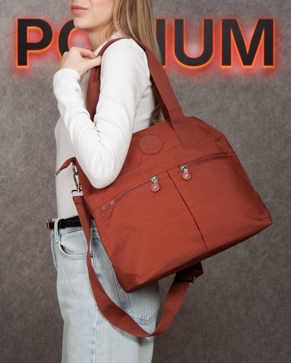 Внутри находится основное и дополнительное отделения, разделенные карманом-перегородкой на молнии, большой боковой карман на молнии и открытый двойной карман. На фасаде находится дополнительно отделение на молнии и два кармана на молнии. На обратной стороне сумки есть вместительный карман на молнии.