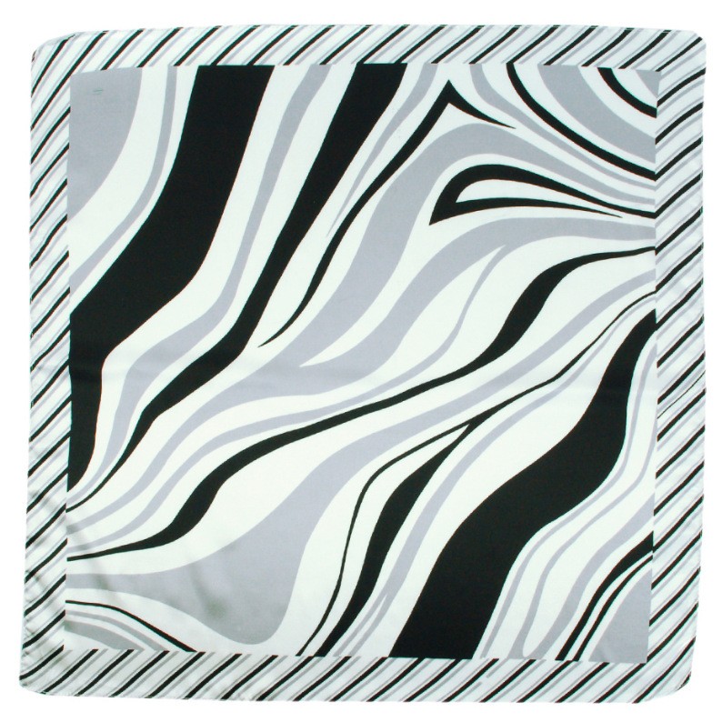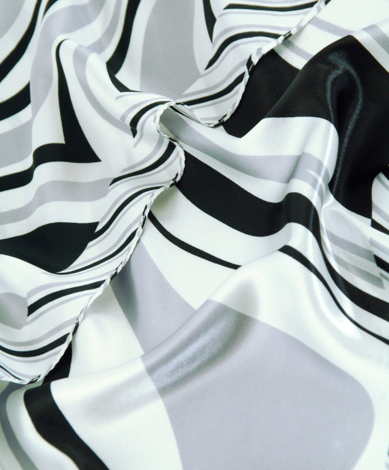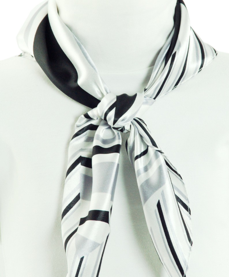 Атласный платок на шею, рисунок- серо-черные полоски разного размера на белом фоне