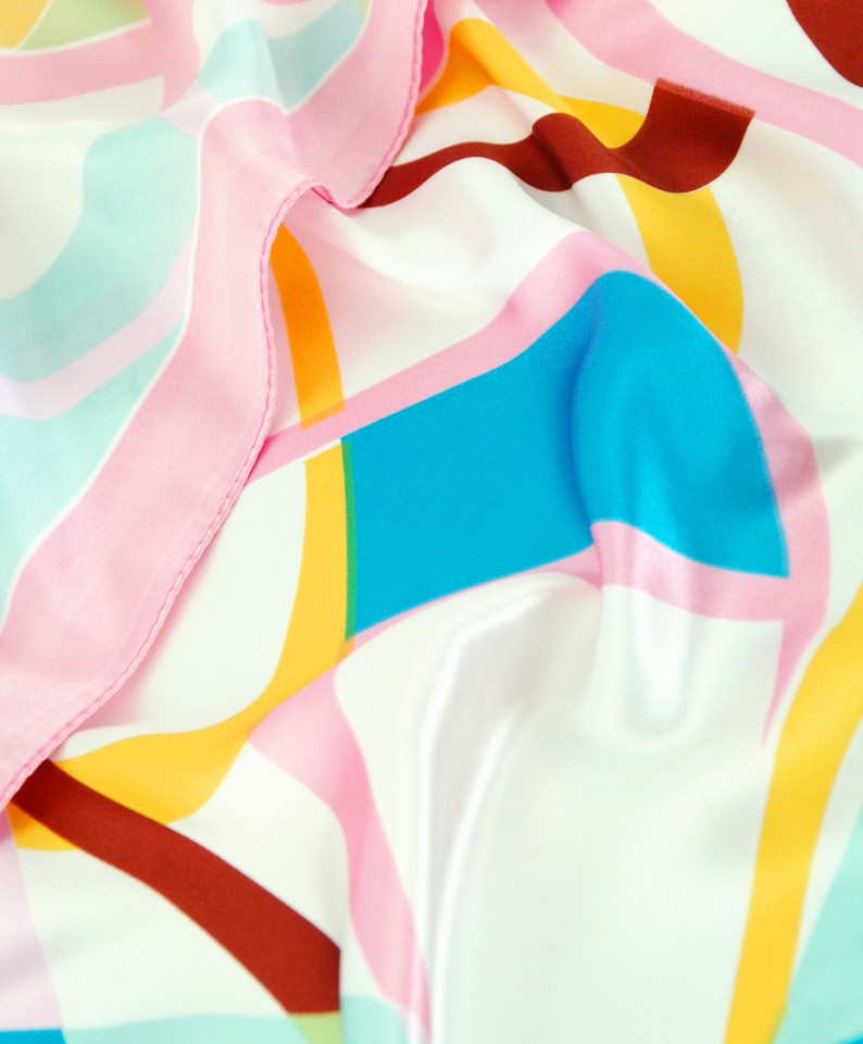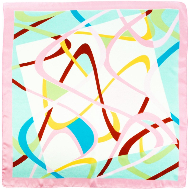 Атласный платок на шею с рисуноком разноцветных пастельных лент, общий тон- розовый