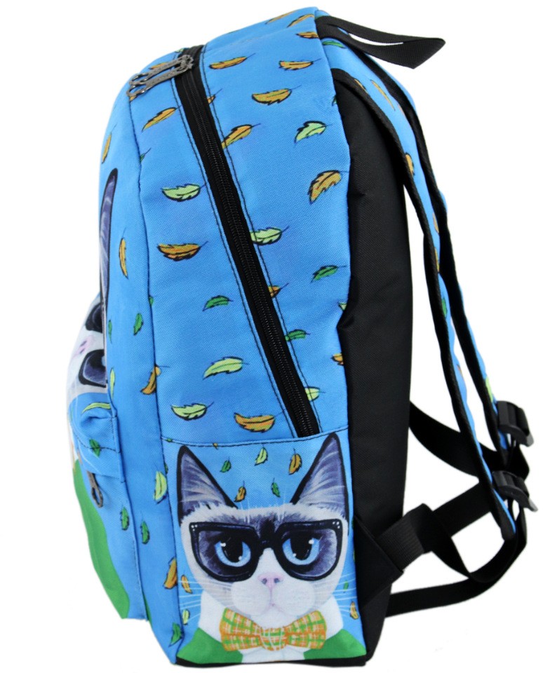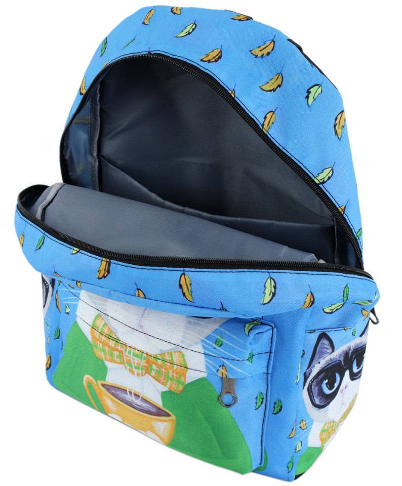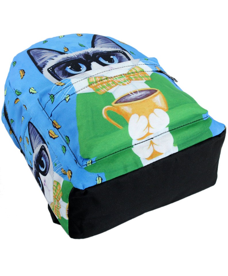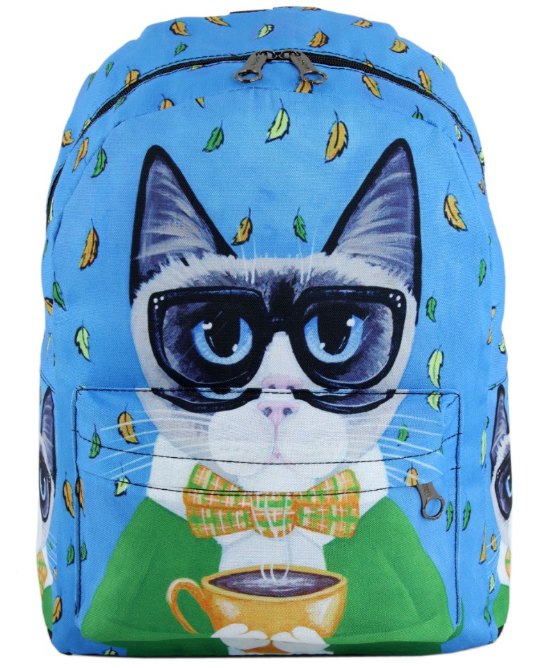 Холщовый рюкзак с принтом- кот в бабочке и очках. Основное отделение на молнии, внутри- уплотненный карман для планшета. Два боковых кармана и накладной карман на молнии, с лицевой стороны. Уплотненная спинка. Регулируемые плечевые ремни.
