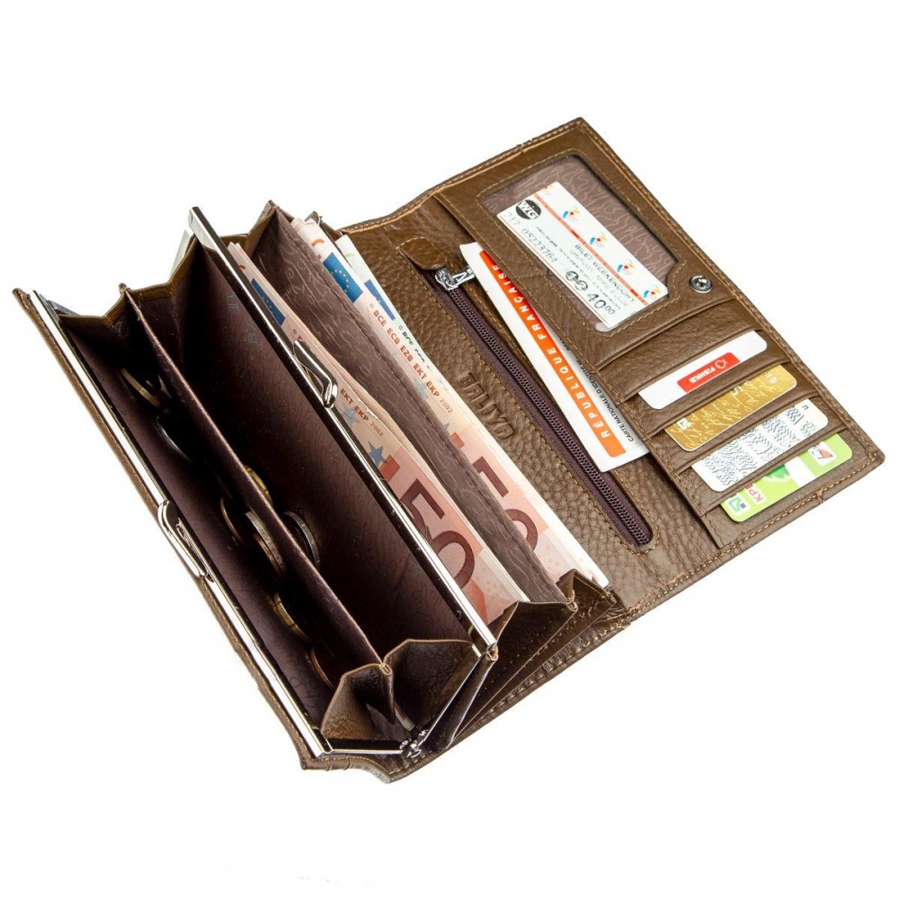Количество отделов: 3 отделение для купюр; 9 слотов для карточек; монетница на механической застежке; открытый карман; карман на молнии; открытый карман сзади кошелька