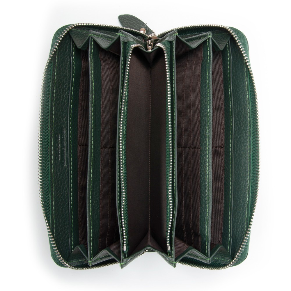 Количество отделений: 4 отделения для банкнот, карман-перегордка для мелочи на молнии, 2 больших открытых кармана и 36 карманов для визитных карт. Снаружи кошелька на обратной стороне находится большой карман на молнии.