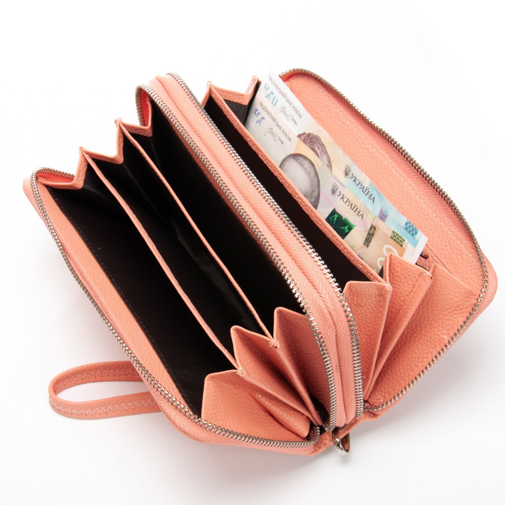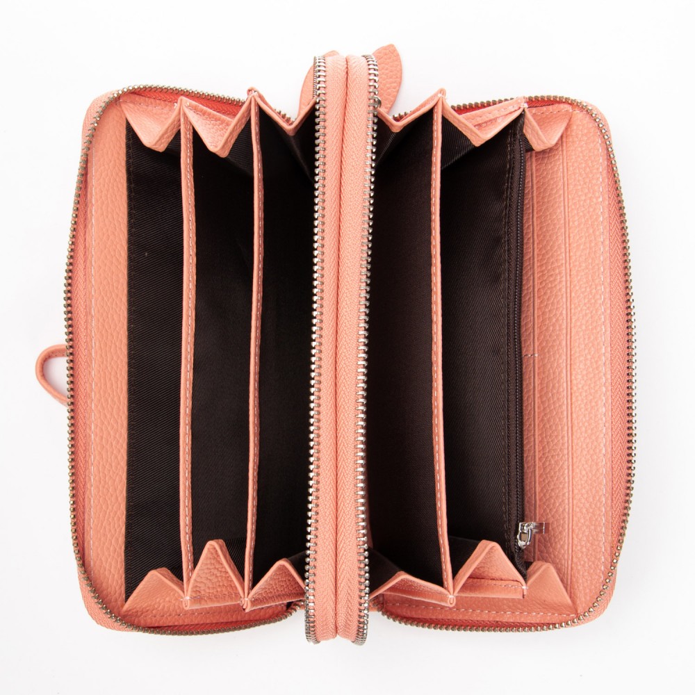 Количество отделений: 2 отделения, закрываются на молнию. Внутри каждого отделения есть 3 кармана для банкнот. В переднем отделении также находится карман для мелочи на молнии, два больших открытых кармана и 8 карманов для визитных карт.