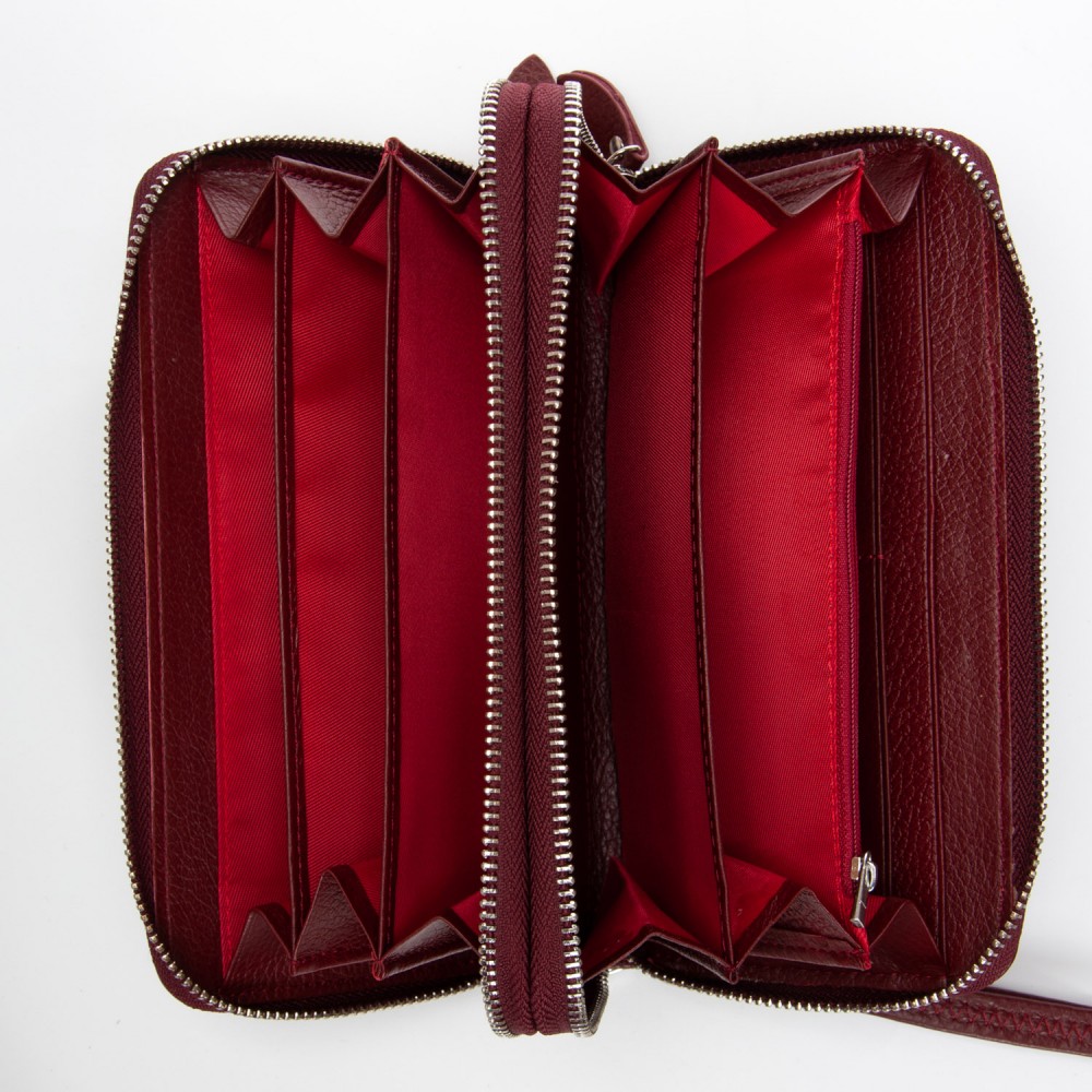 Количество отделений: 2 отделения, закрываются на молнию. Внутри каждого отделения есть 3 кармана для банкнот. В переднем отделении также находится карман для мелочи на молнии, два больших открытых кармана и 8 карманов для визитных карт.
