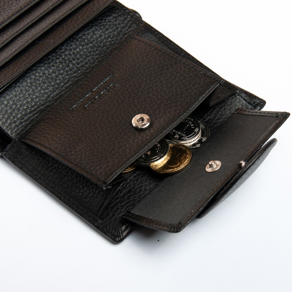 Внутри находятся 2 открытых отделения для банкнот, разделенные кожаной перегородкой, 3 кармана для визитных карт и два больших прозрачных кармана на откидном блоке. Также внутри кошелька находится монетница под клапаном на кнопке.