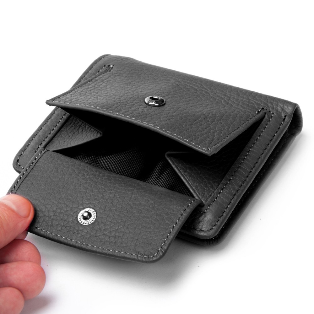 Количество отделений: 2 больших открытых отделения для банкнот (разделены кожаной перегородкой) и одно отделение на молнии. Также есть 12 карманов для визитных карт, 4 из которых выполнены прозрачными. Снаружи кошелька на обратной стороне есть монетница на кнопке.