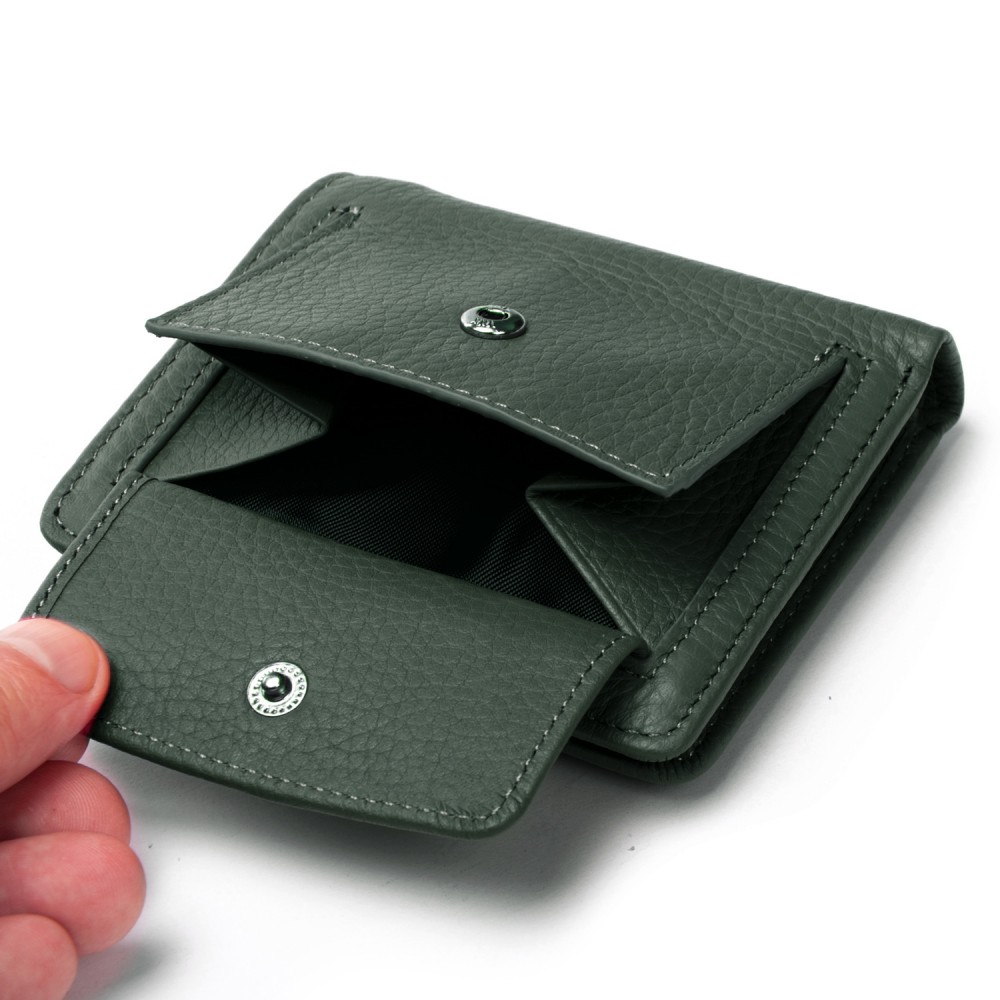 Количество отделений: 2 больших открытых отделения для банкнот (разделены кожаной перегородкой) и одно отделение на молнии. Также есть 12 карманов для визитных карт, 4 из которых выполнены прозрачными. Снаружи кошелька на обратной стороне есть монетница на кнопке.