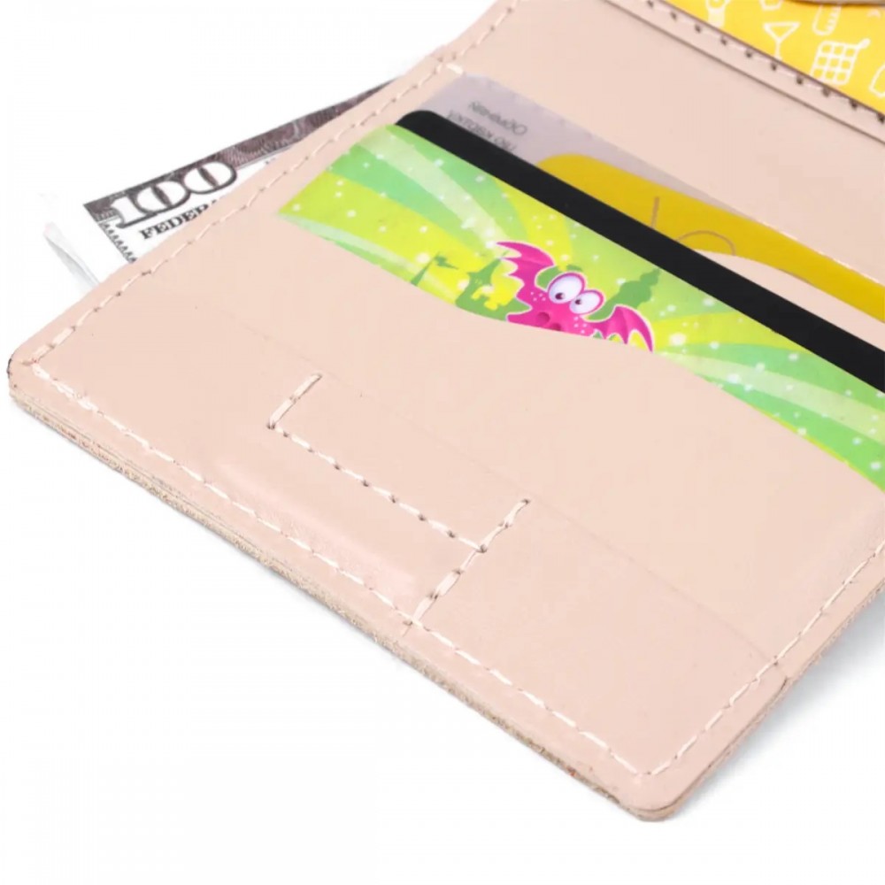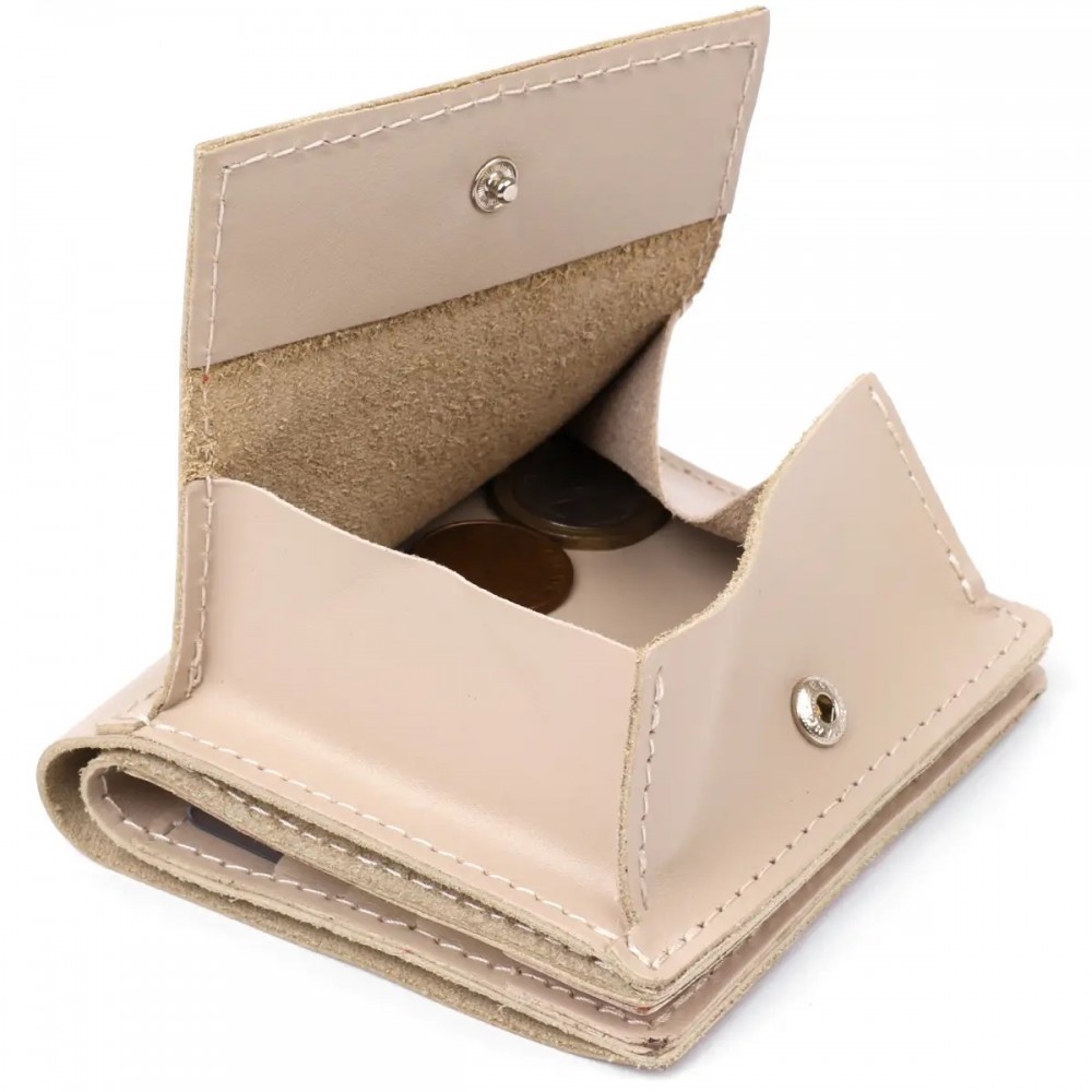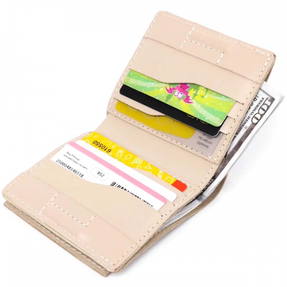 Количество отделений: отсек для купюр, 6 слотов для кредитных и дисконтных карт и монетница на кнопке снаружи кошелька.