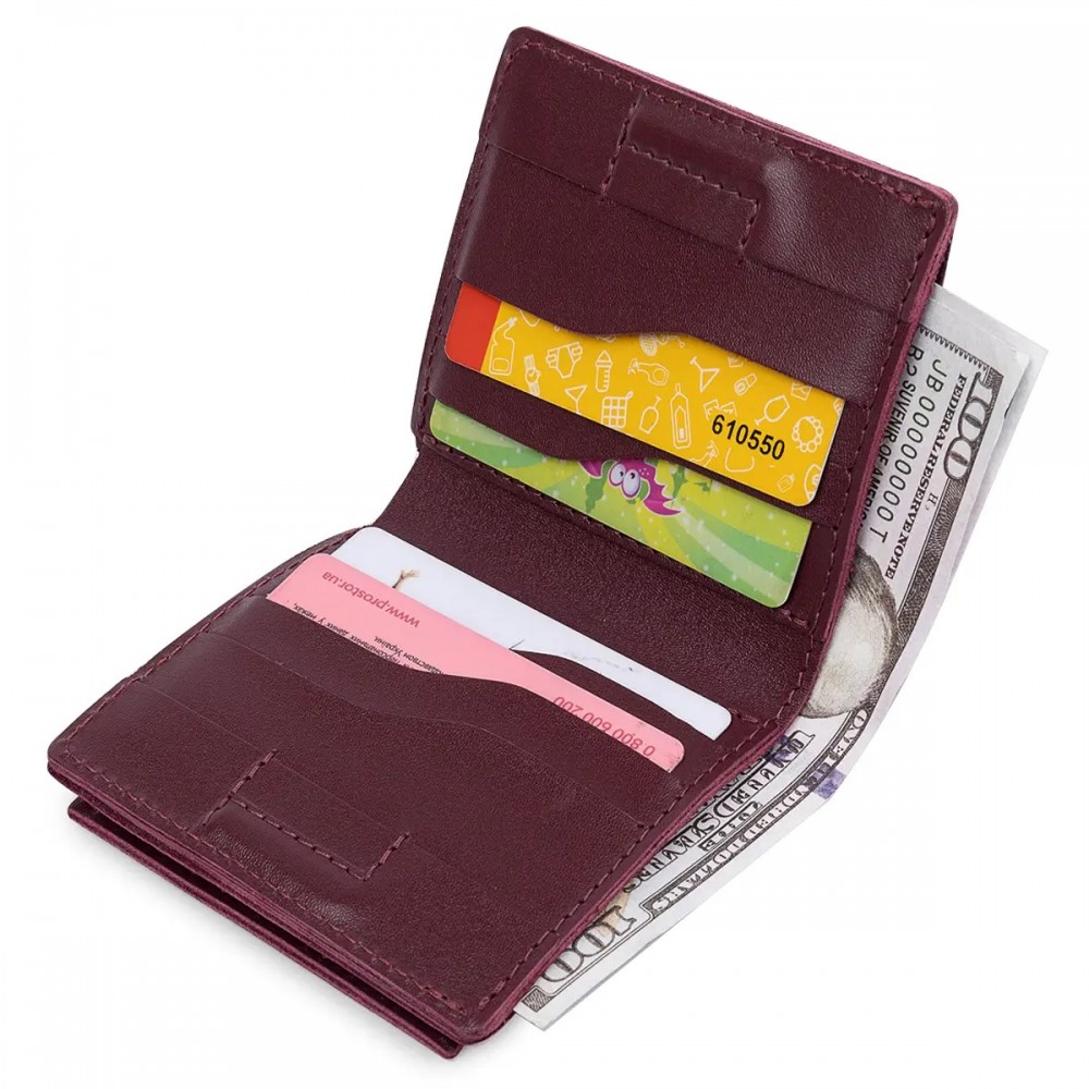 Количество отделений: отсек для купюр, 7 слотов для кредитных и дисконтных карт и монетница на кнопке снаружи кошелька.