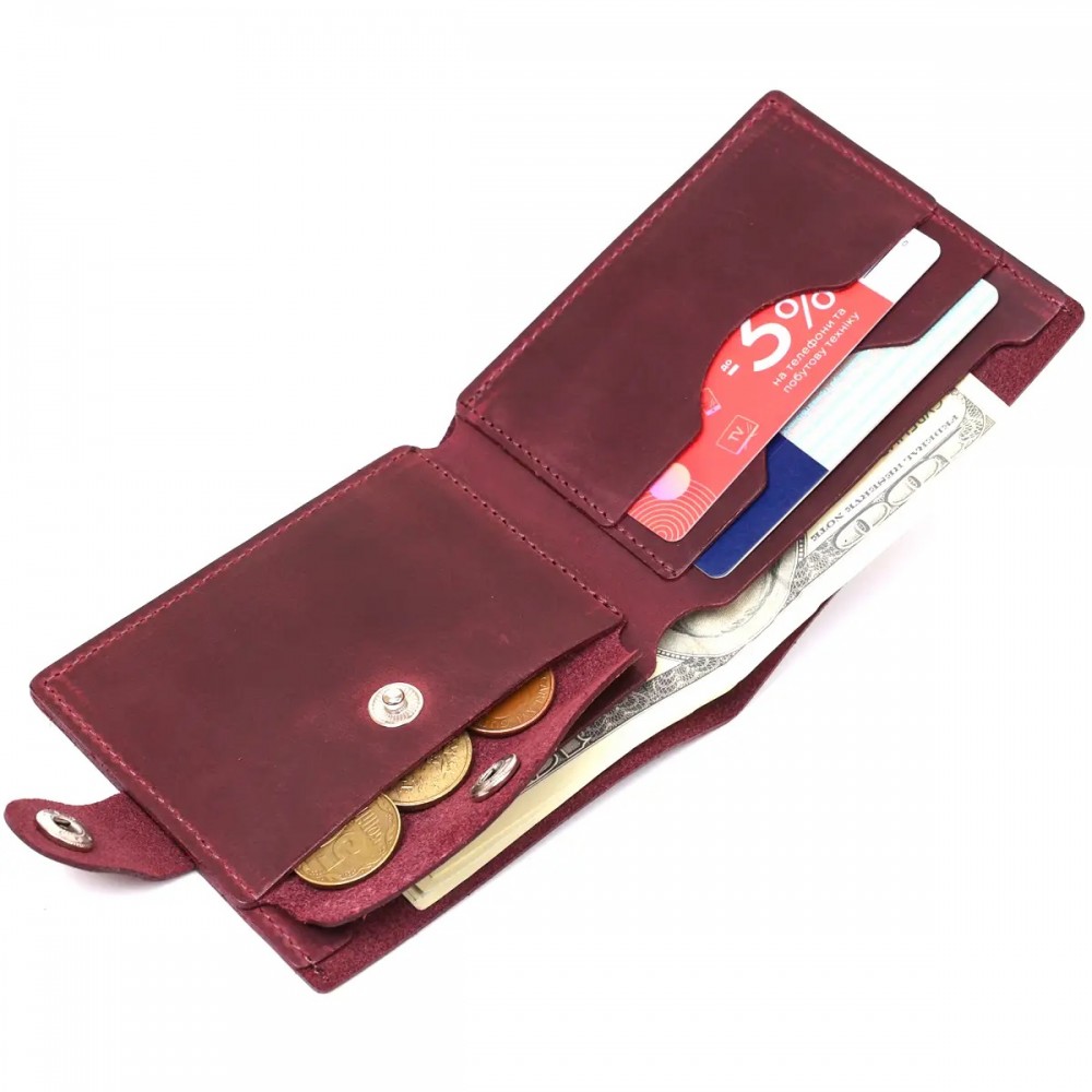 Количество отделений: отсек для купюр, 2 слота для кредитных и дисконтных карт, монетница на кнопке, дополнительный плоский карман.