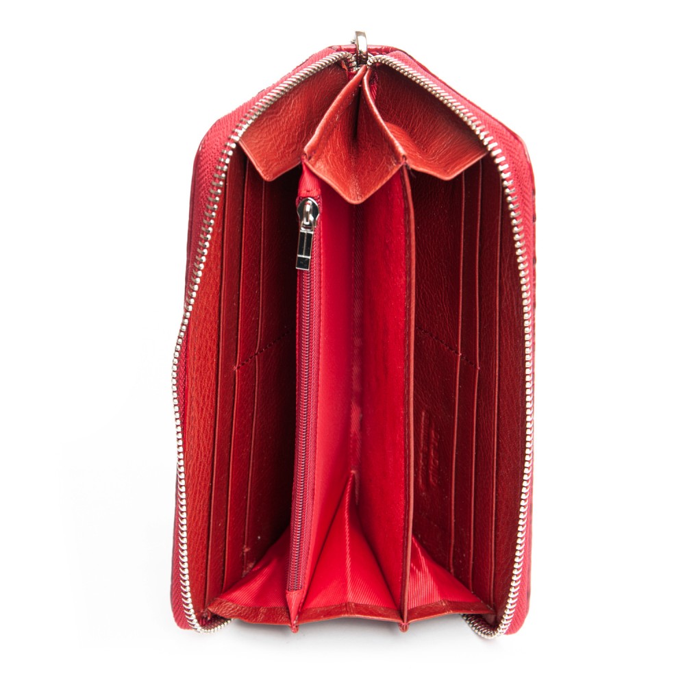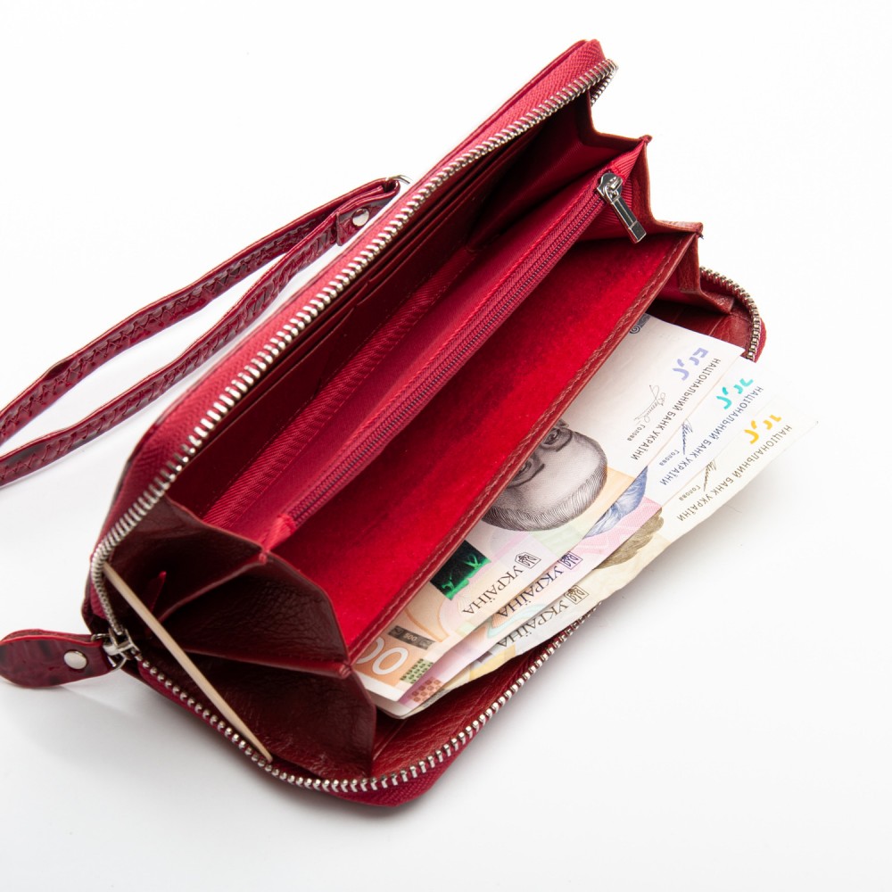 Количество отделений: 3 отделения для банкнот, карман для мелочи на молнии, два больших открытых кармана и 8 карманов для визитных карт. В комплекте кистевой ремешок.